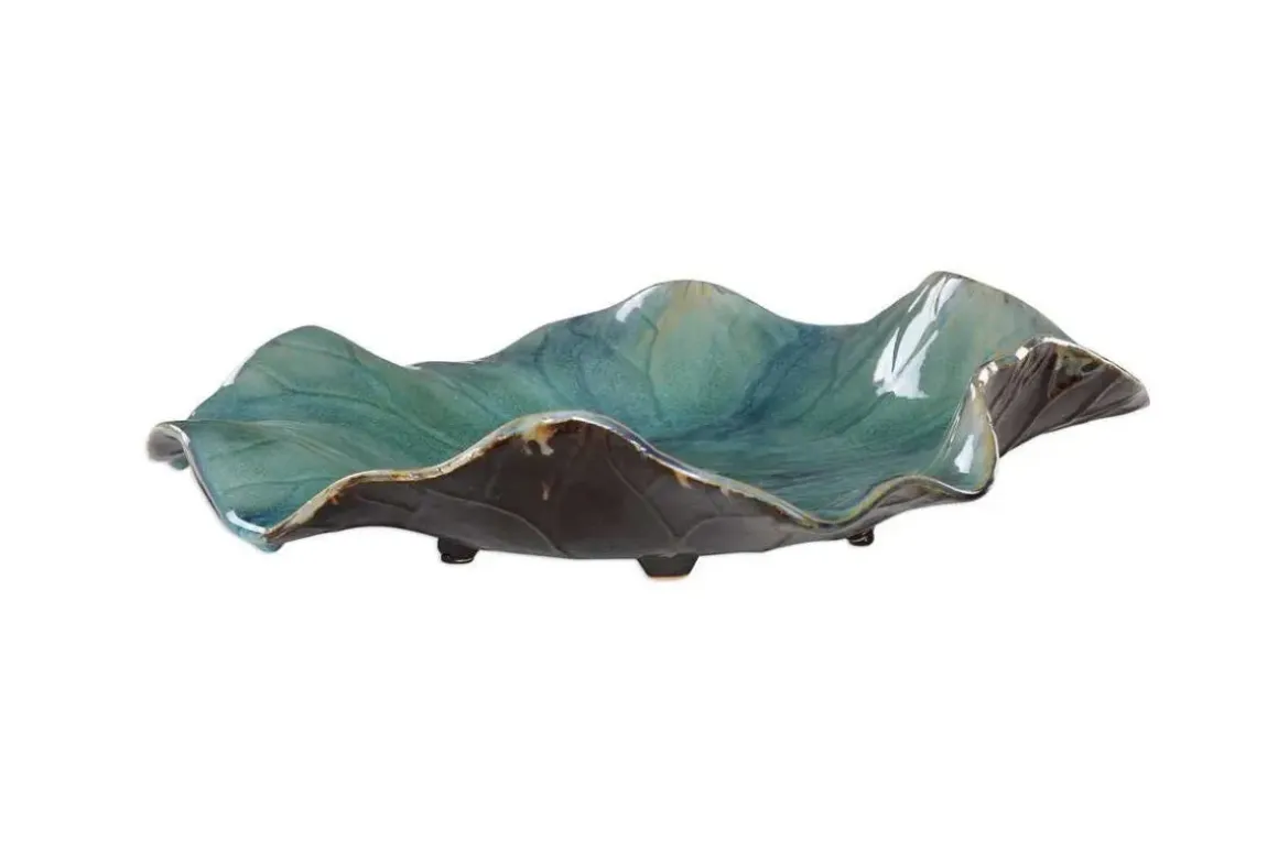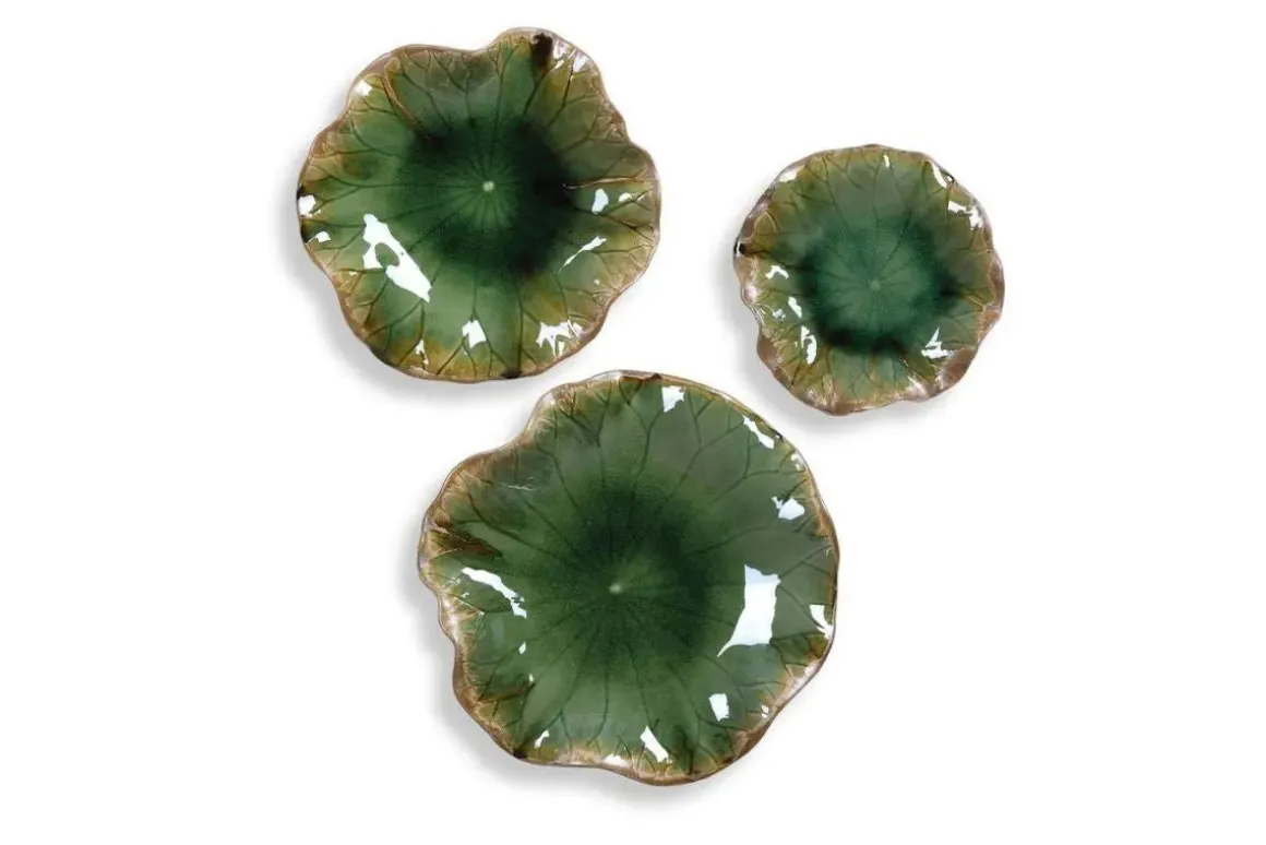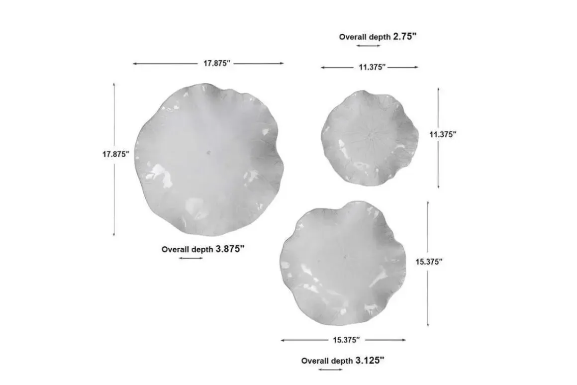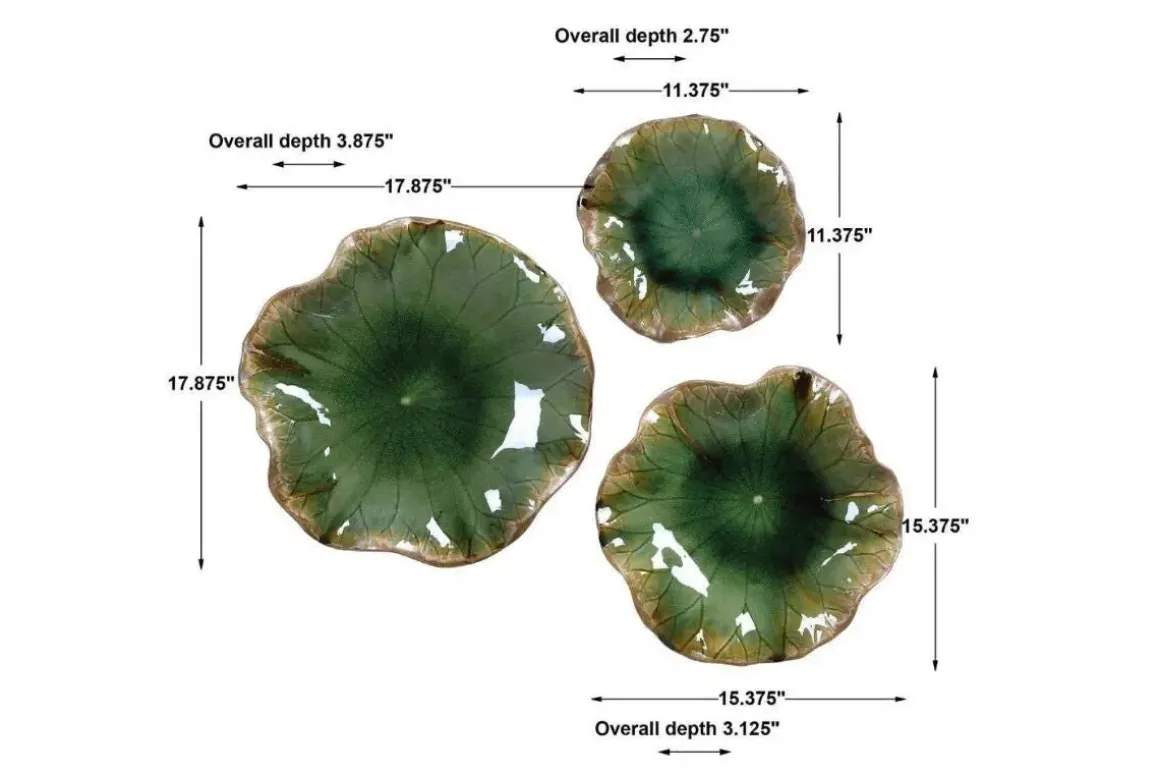 A trio of ceramic flowers with detailed veining, glazed in a rich cobalt blue. May be hung on wall or used as tabletop accessory. Safe for outdoor use, but protection from freezing temperatures is recommended. Sizes: Sm-11x3x11, Med-15x3x15, Lg-18x4x18