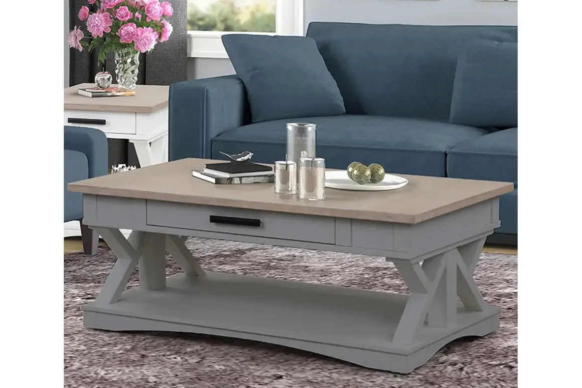 Every living room needs a great coffee table, and the Americana Coffee Table in Gray will surely look great in yours. The trestle style table with a slab top provides lots of room for books, drinks, snacks, or whatever you want to put on it. A convenient storage drawer helps you keep your space organized and tidy. The Americana Coffee Table in Gray looks great with any accent color and is sure to complement your space.