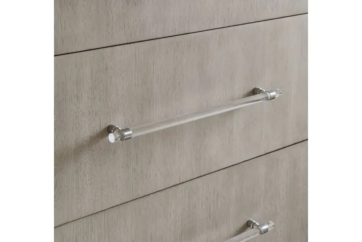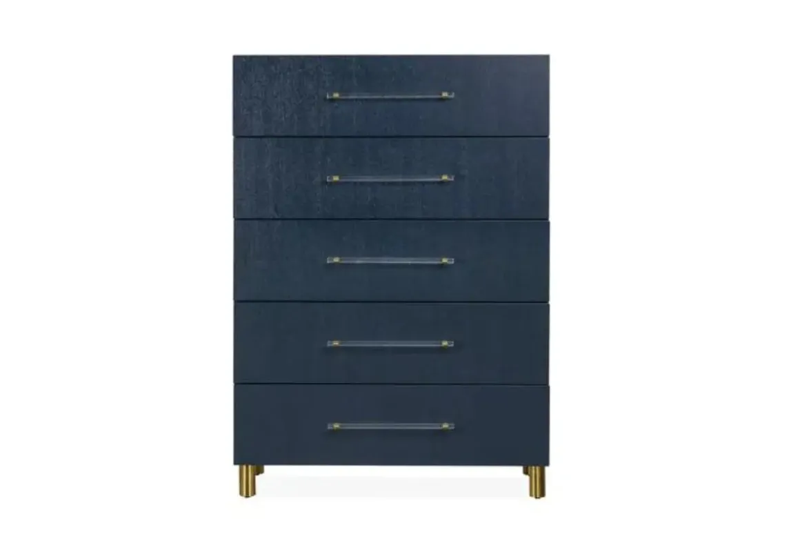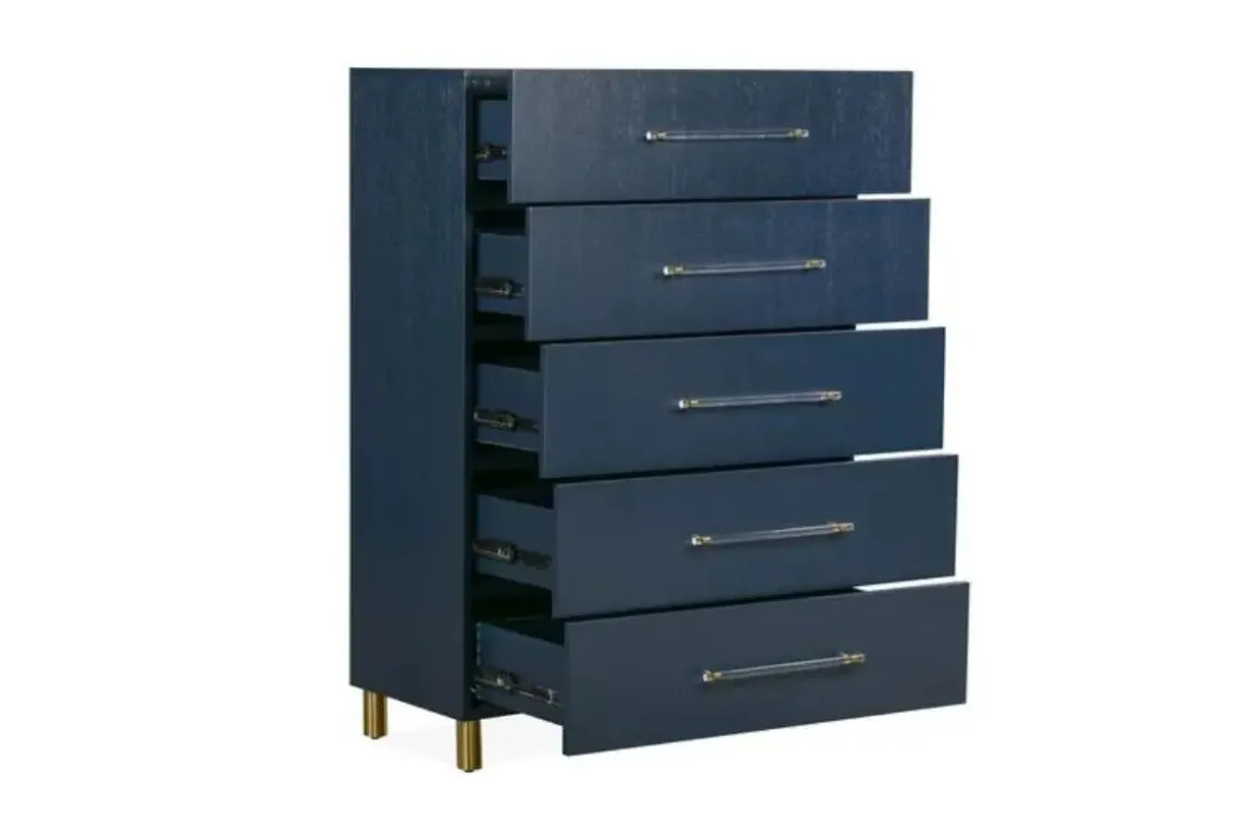 Paring organic shapes with sharp minimalist edges in a showcase of navy blue and brass, the Argento Chest in Navy Blue provides a modern glam style that is truly stunning. Tight, straight-grained oak veneer delivers natural textures under a thick and rich Navy finish that is accented with round brass accents on the legs and pulls. The custom pulls, fabricated from cylindrical acrylic, bring the entire piece to the next level.Product Details:• Removable black felt liner in top drawers for storing jewelry or other delicate items• Full extension, ball-bearing drawer slides for smooth, efficient operation• 5-sided hardwood plywood drawer boxes with front and rear English dovetail joinery