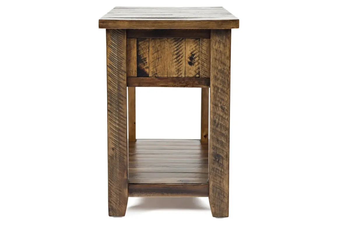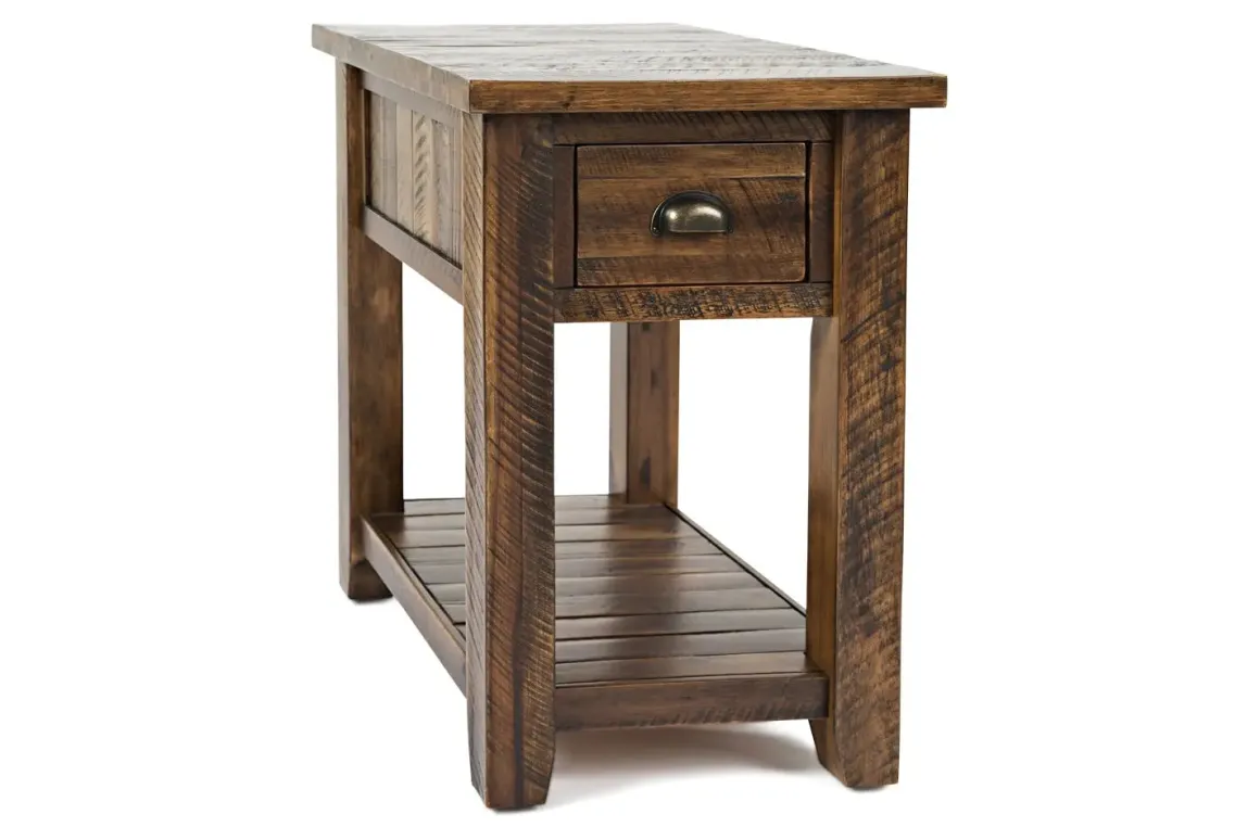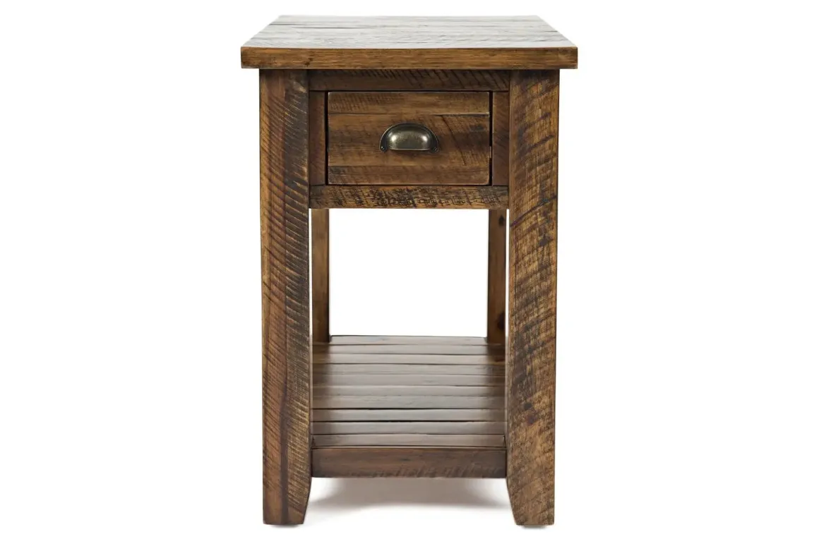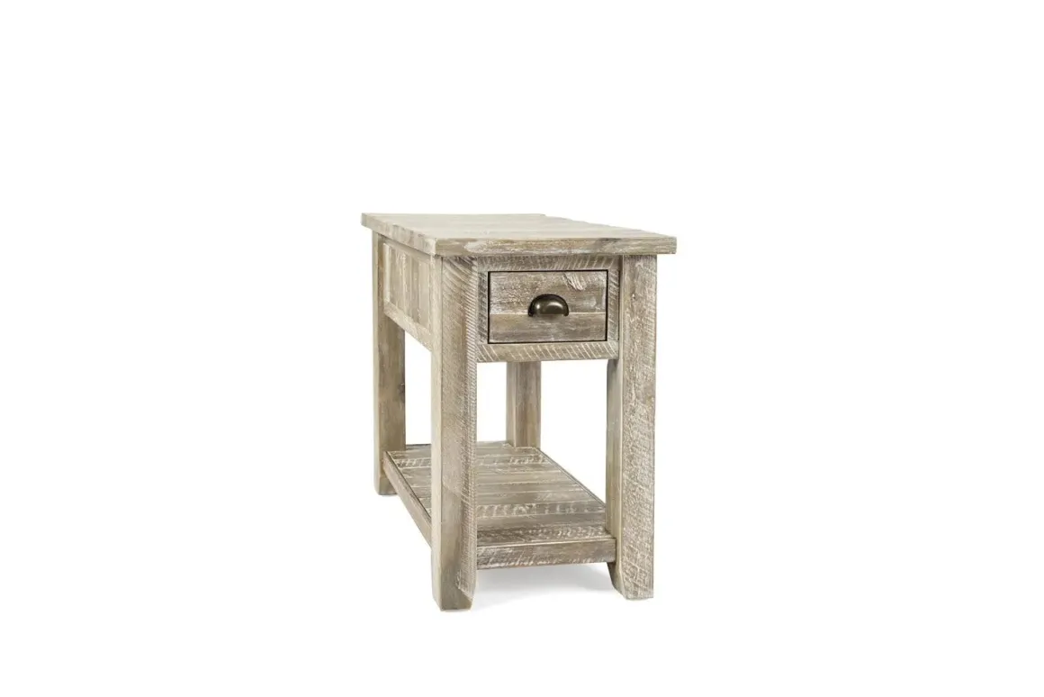 The Artisans Chairside Table in Gray pairs clean lines with distressed wood and vintage-style hardware for modern rustic appeal. Its petite frame makes it the perfect stage for a book and cup of coffee.
