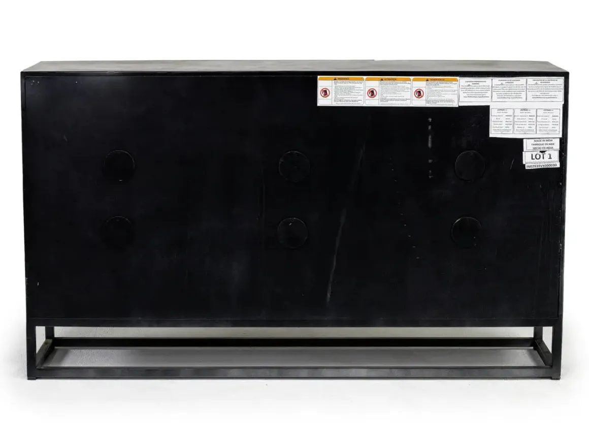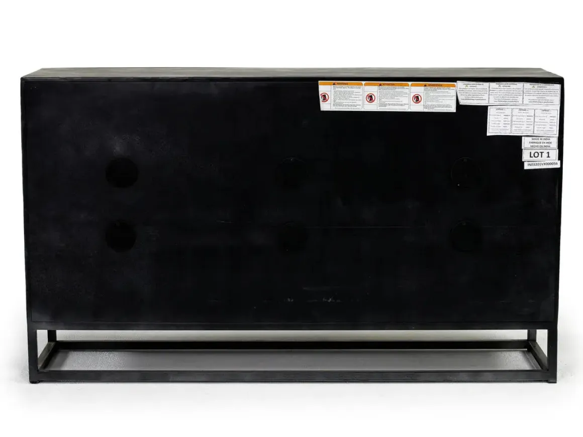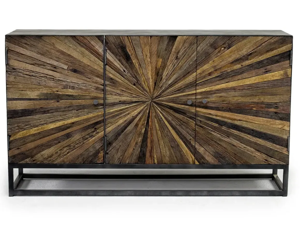 Natural wood and iron materials meet in this modern and contemporary cabinet design to create a surprisingly finished look. The Astral 3 Door Accent Cabinet in Gray Wash includes two storage sections with hinged doors and cord management cutouts. White wood inlays with black and gray markings are arranged in a radiant design that emerges from the center of cabinet.
