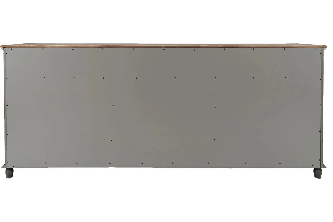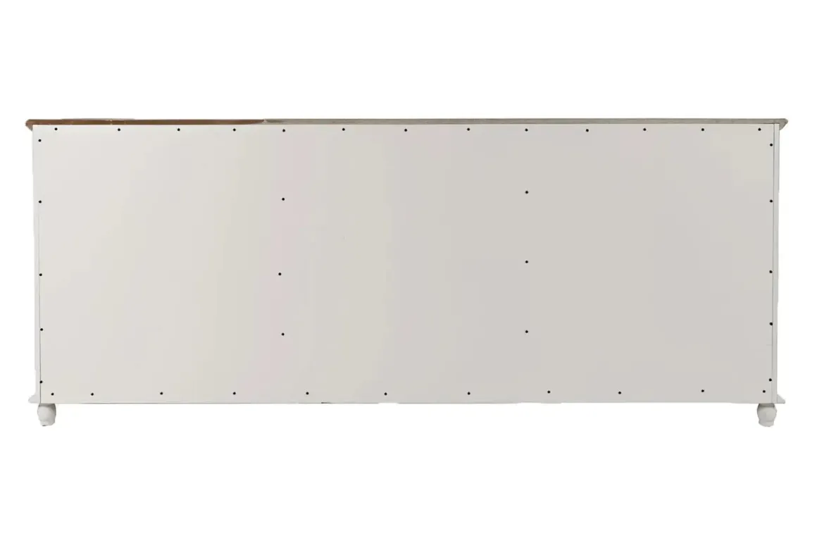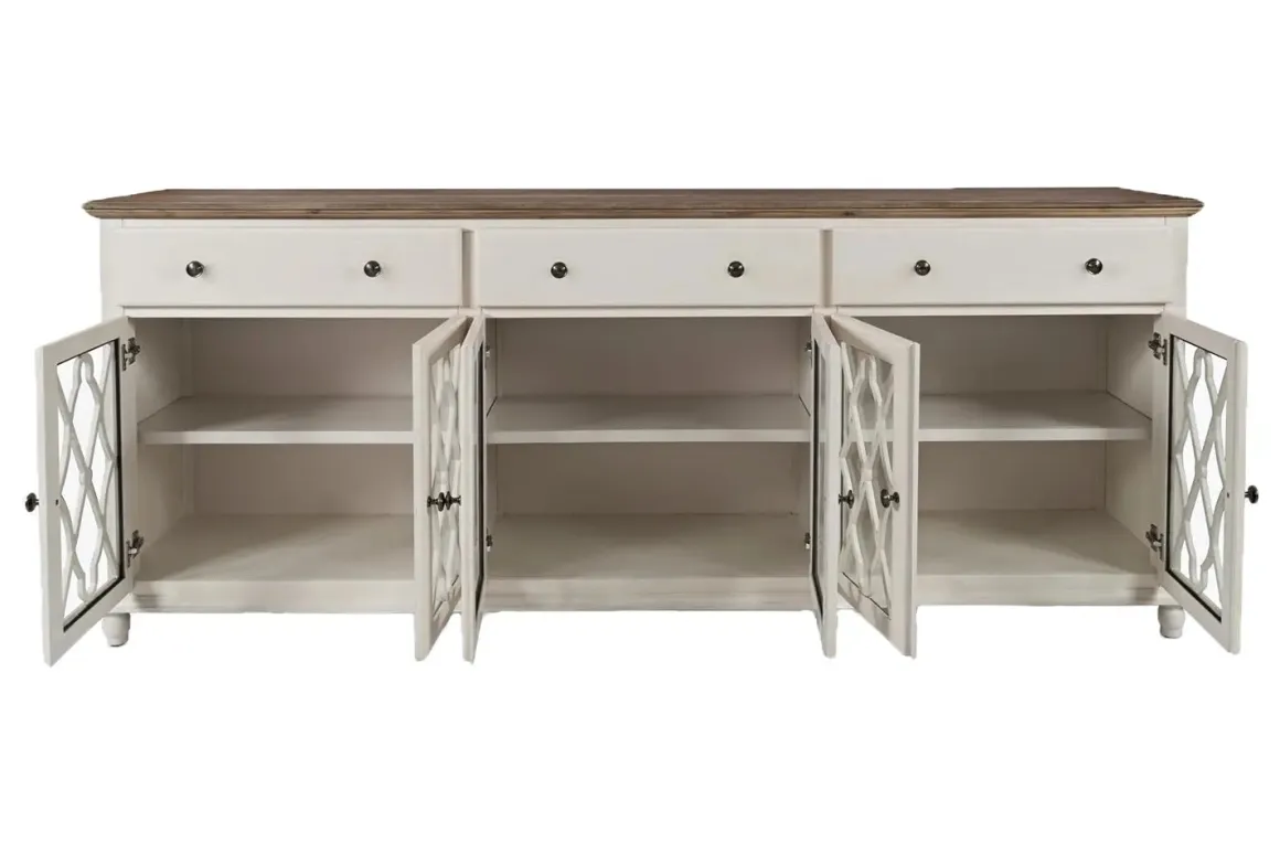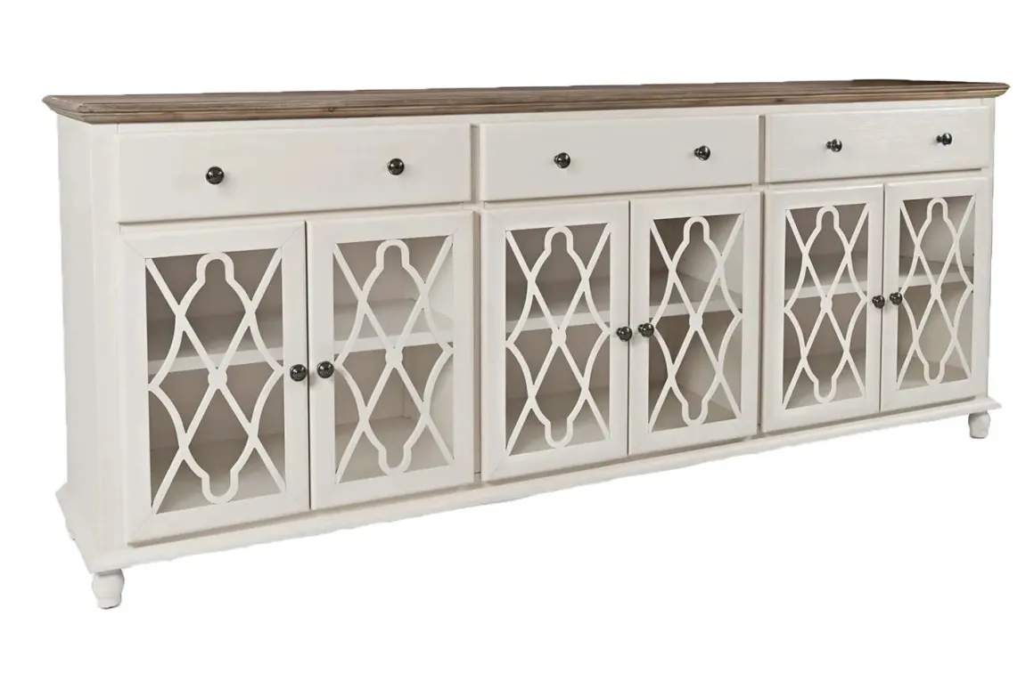 Do you need some serious storage in your home? Designed with multiple doors and drawers, you can keep any space in your house tidy with the Aurora 6 Door Console in White. Interior shelves are strong and durable and the top is easy to clean and care for on a daily basis. A modern touch with an eye on classic style makes this a perfect fit in any home.Product Details:• Perfect for a modern or transitional space• Includes three drawers for easy storage options with or without internal dividers• Six glass-front drawers with wood accents bring your room design to lifeDimensions:• 86”W x 17”D x 35”H