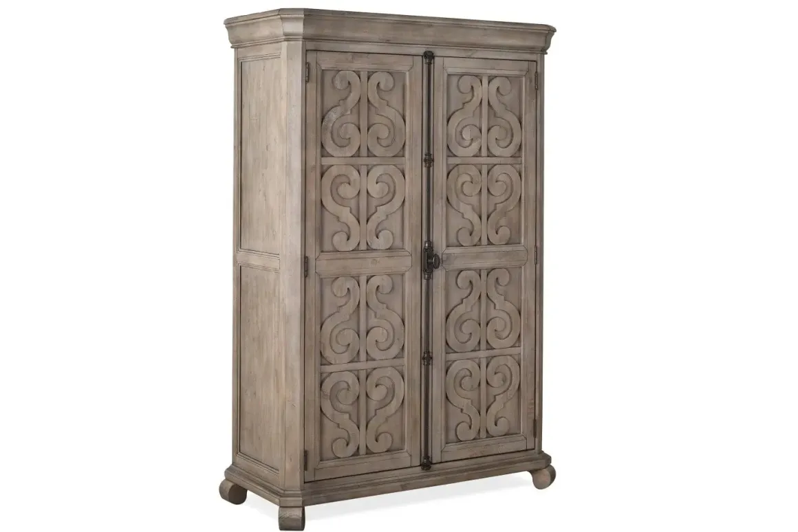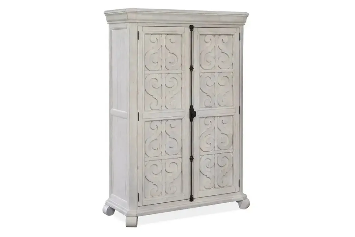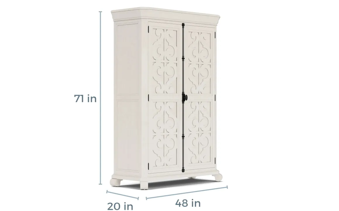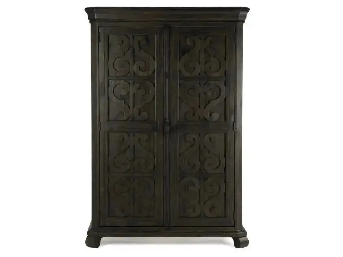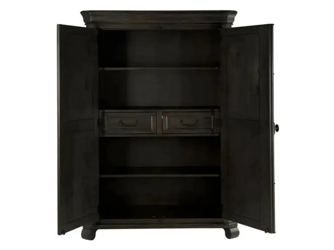 The Bellamy Armoire in Charcoal is a remarkable statement piece that combines beautiful craftsmanship with abundant storage. This large chest features handsome paneled doors, 2 adjustable wood shelves and two drawers with black matte Pewter-finished hardware.