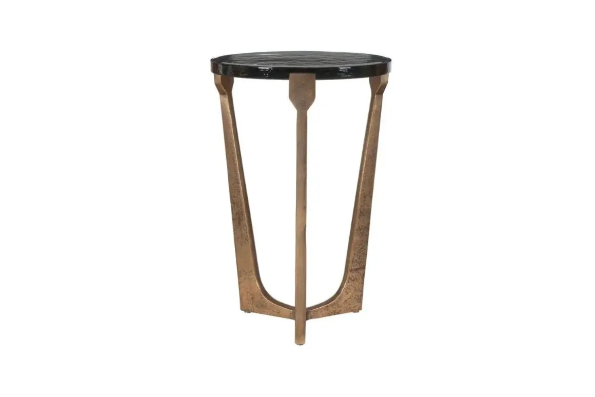 Crafted from a combination of antique brass finished cast aluminum and rich cast glass, this accent table showcases exquisite craftsmanship. The warm tones of the brass frame complement the unique texture of the glass top, creating a truly captivating piece. Suitable for both indoor and outdoor use.