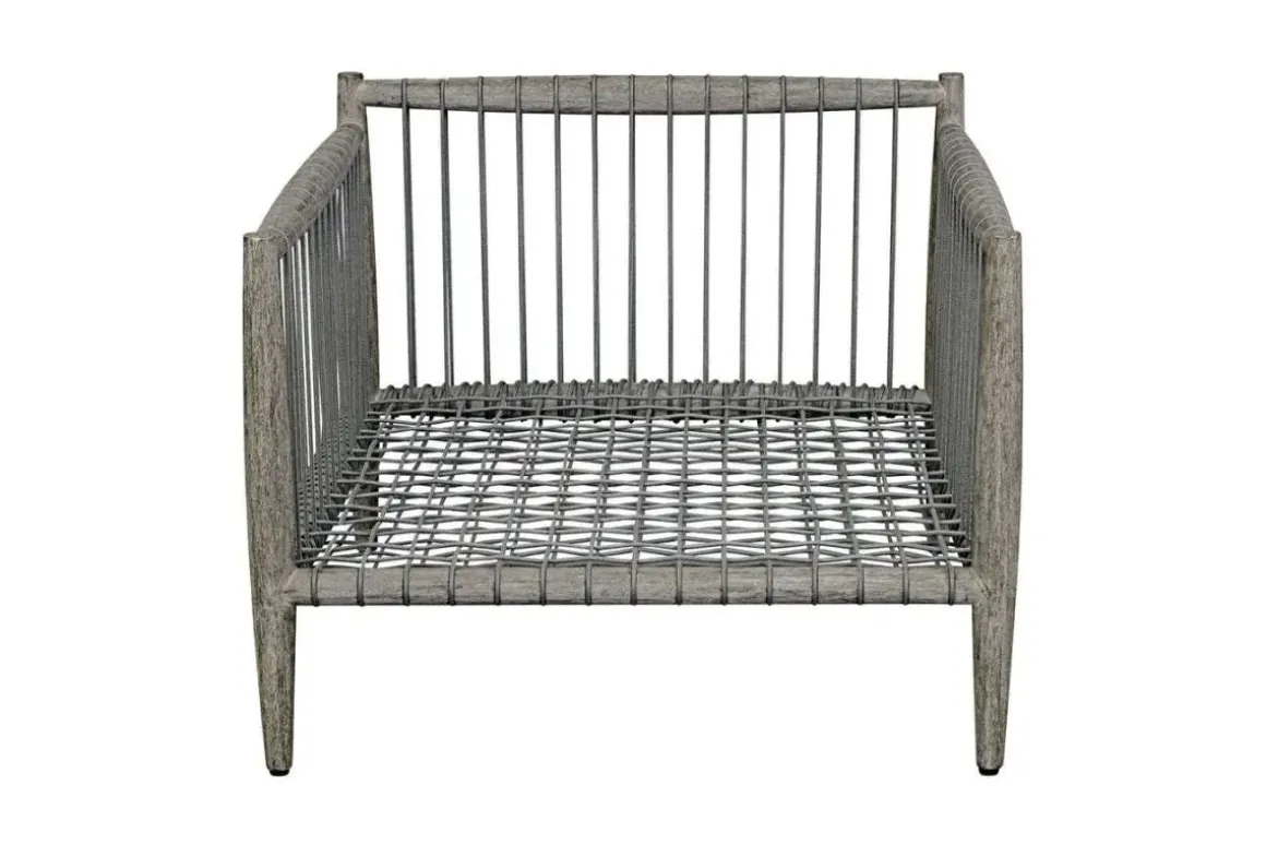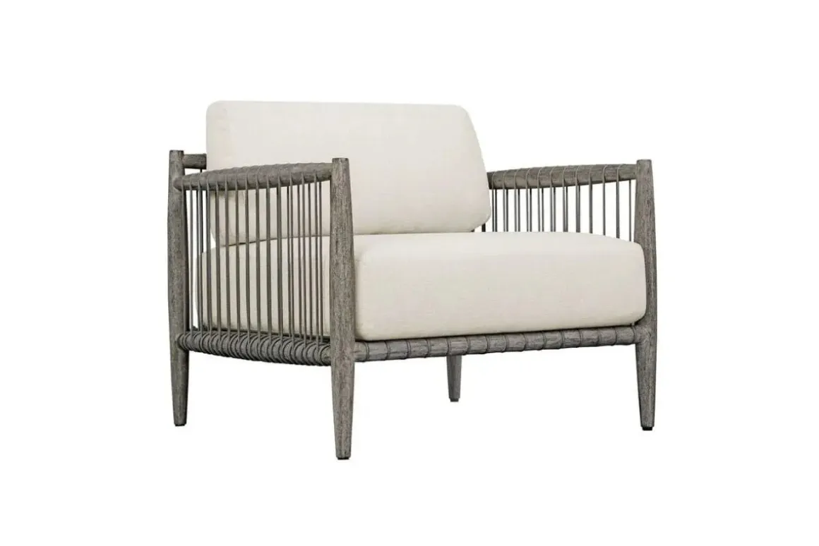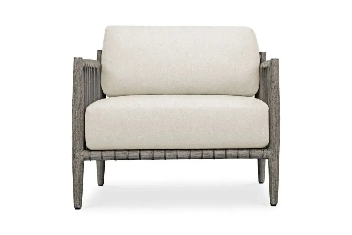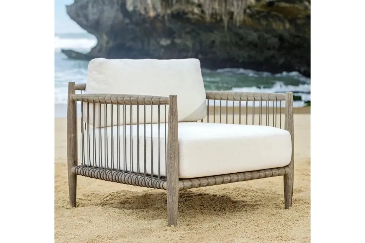 Crafted from rich, weathered dark gray mahogany and adorned with hand wrapped charcoal gray rope along the sides, the Borneo Lounge chair offers a touch of rustic elegance. Oyster white cushions in solution dyed acrylic fabric provide a comfortable contrast to the natural wood and woven accents.