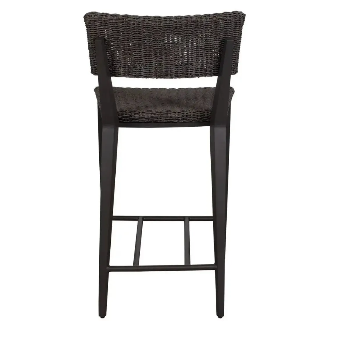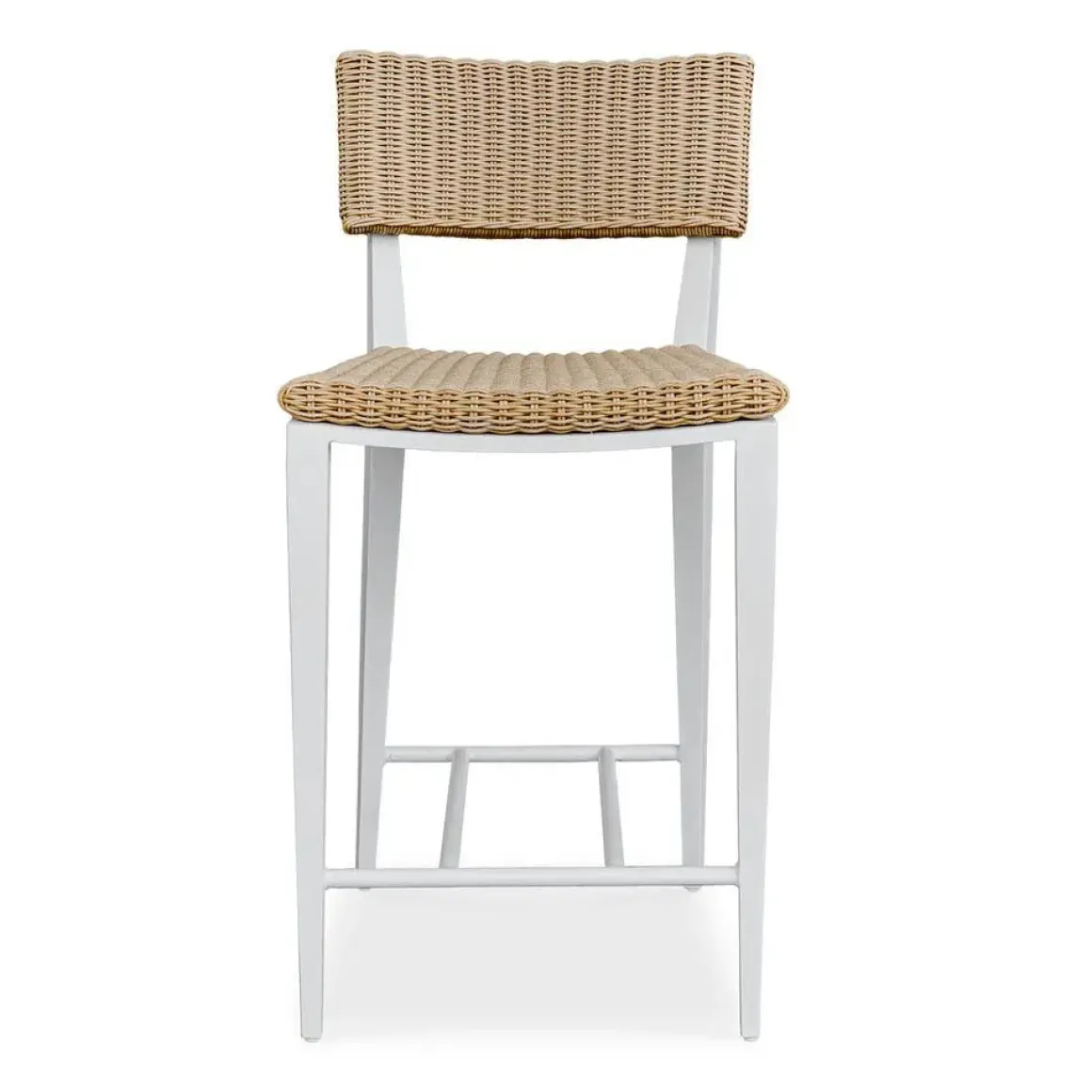 The Calbas counter stool perfectly blends style and comfort. The crisp white, powder coated aluminum frame and hand wrapped, honey toned all-weather wicker create a harmonious look that will enhance any outdoor setting.
