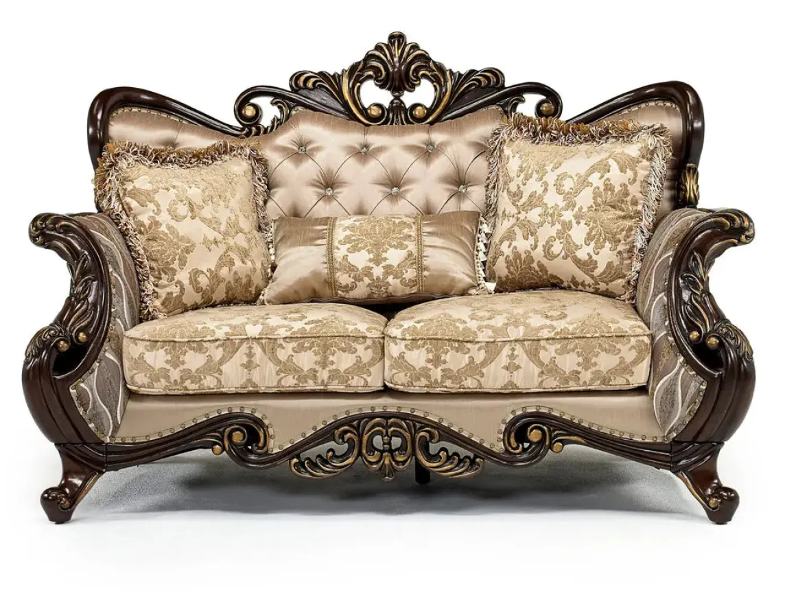 A matched pair in contrasts of delicate details and solid construction, the Constantine Sofa & Loveseat in Gold transport you to eras of timeless style and opulence. The satin finish of the upholstery as well as the floral designs on the cushions and pillows add to the rich character of this furniture. Experience luxurious and comfortable seating when you choose this set for your living or sitting room.Product Details:• Tufted diamond back design• Metallic gold accents on the frames• Each piece includes two decorative pillowsDimensions:• Sofa: 94”W x 37”D x 46.75”H• Loveseat: 69”W x 37”D x 48”H