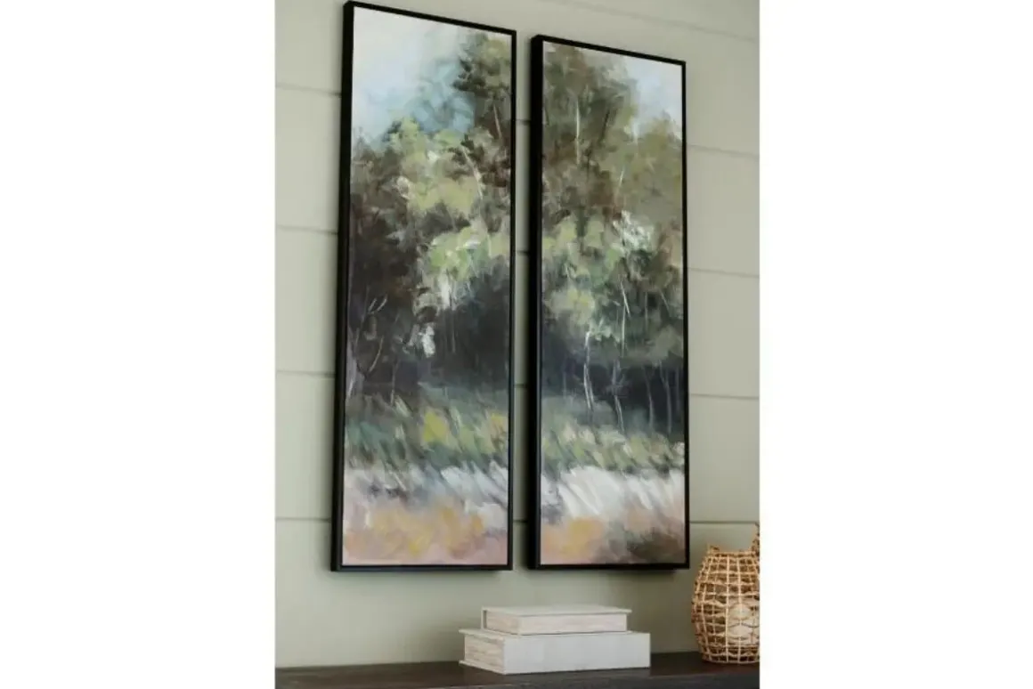 Immerse yourself in the beauty of nature with Dansot Wall Art. This captivating two-piece wall art set showcases a whimsical treescape depicted in a calming palette of green, brown, blue, and white. Ideal for modern farmhouses or casual interiors, this wall art brings the outdoors in, grounding your space with its intricate portrayal of a serene wooded scene. Product Details: • Framed gallery wrapped canvas • D-ring bracket for hanging • Hand-painted embellishment