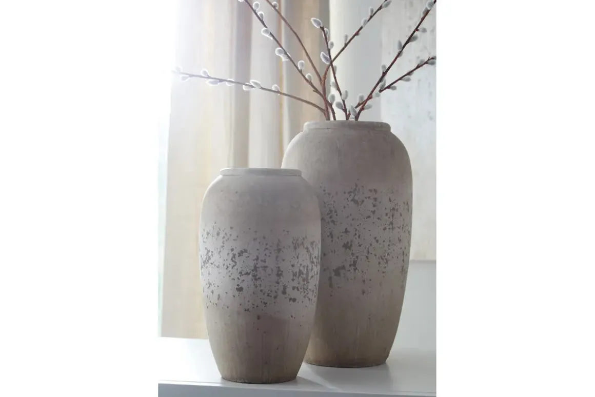Bring the look of antiques into your home with the Dimitra Ceramic Vases, Set of 2. With one larger vase and one smaller, you can use levels to create visual interest with ease! These vases would look great in an entryway, den, or foyer. Equally beautiful empty or filled with decorative flowers or greenery, they can add life to a dull corner. Fill your home with beautiful decor and create a space made for living!Product Details:• Painted ceramic finish• Neutral shades complement most decor colors• Can hold decorative plants or greeneryDimensions:• Large Vase: 8”W x 8”D x 14.75”H• Small Vase: 7”W x 7”D x 12”H
