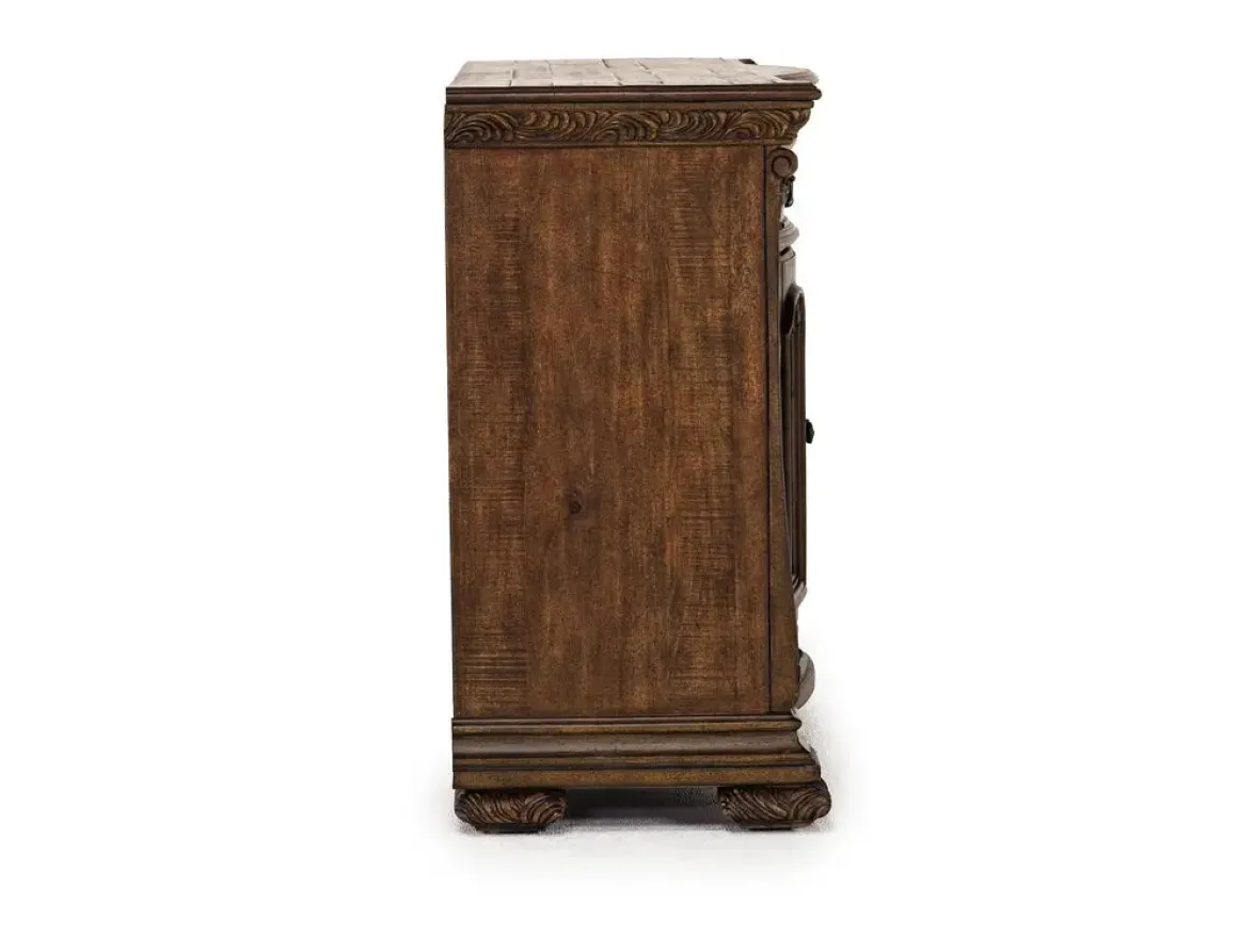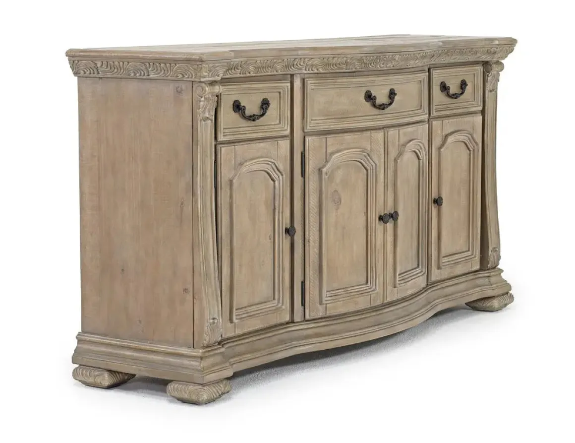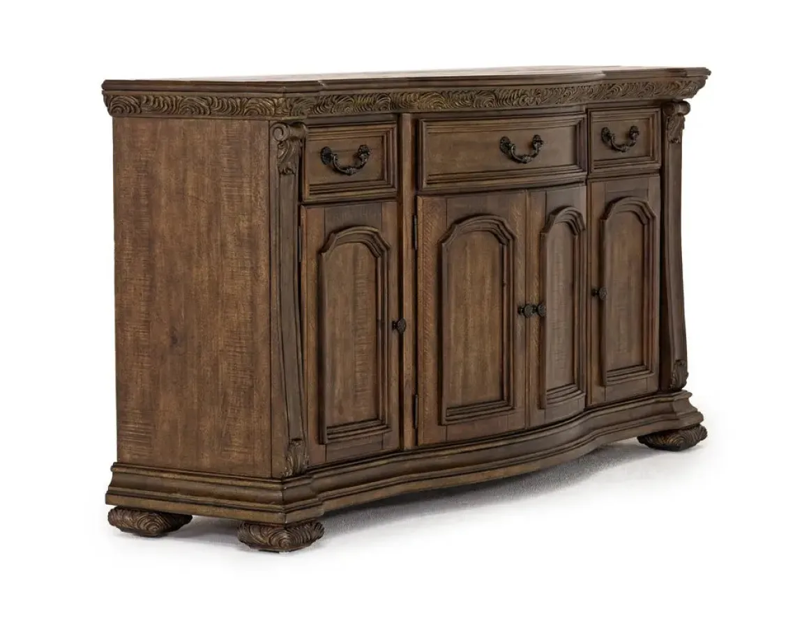 The Durango Buffet in Willadeene is a classic solid pine wood piece that would make the perfect addition to a dining room or other space in your home. This elegant piece, with its Willadeene Brown finish and decorative details, is as functional as it is beautiful. It has three felt-lined top drawers, two center cabinet doors, and two side doors with an adjustable shelf to meet all your storage needs.
