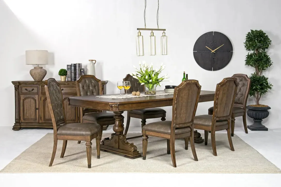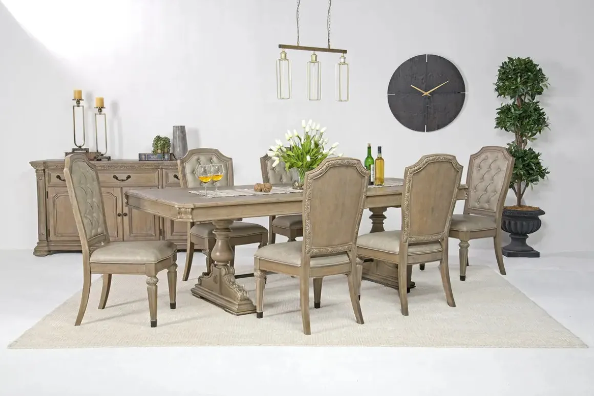 Impress your guests with this gorgeous Durango Dining Table & 6 Chairs in Fawn. This dining room set will quickly become the centerpiece of your home as your family and friends gather around for a delicious meal. Notice the delightful details, like the harp-shaped seat backs and the richly designed trestle table base. This dining room set offers a luxurious look, comfortable foam cushions, and seating for six. Product Details: • Elegant, classy fawn color • The butterfly leaf in table allows easy extension for holiday gatherings • Rectangle shaped table in standard table height