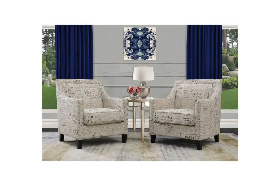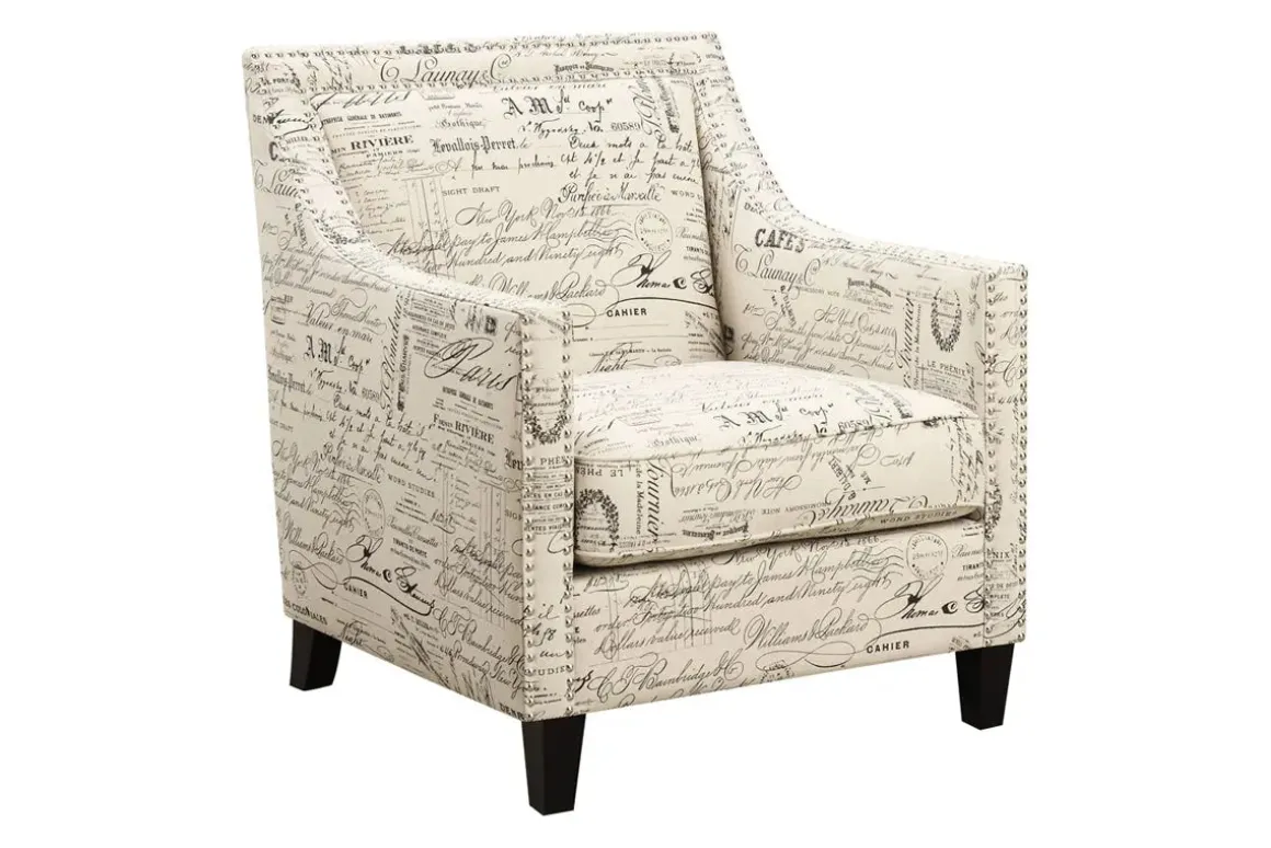The fun and refreshing Emery Accent Chair in French Script combines a contemporary design with a vintage flair. This fashionable chair features French Script fabric upholstery, straight arms, a low back, and clean lines, accented with a classic nailhead trim.