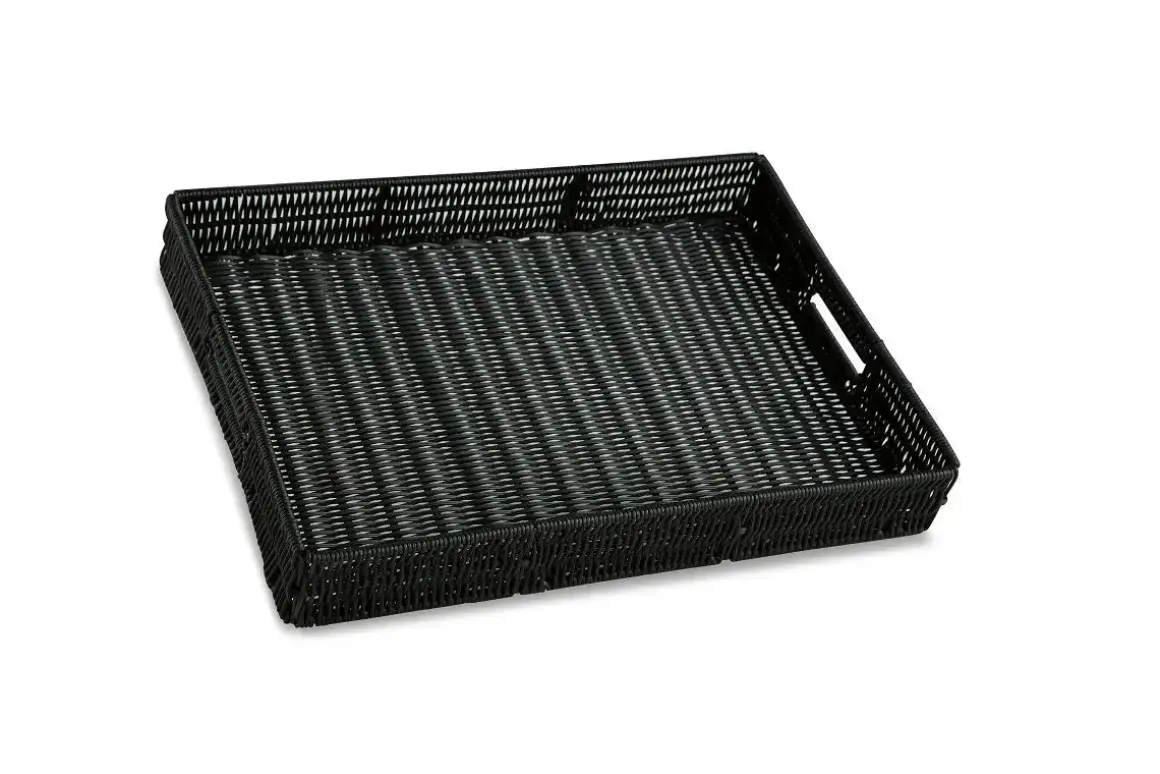 Featuring a unique, versatile style, the Evonne Tray in Black is a chic indoor/outdoor piece that will punctuate your tabletop decor. Its black faux rattan design is a stunning backdrop for whatever you serve up or display. Product Details: • Made with faux rattan and metal • Safe for indoor and outdoor use • Contemporary black finish