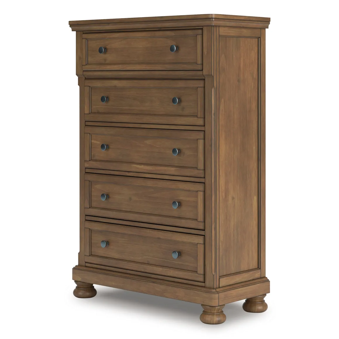 Bring warm, timeless character into your bedroom with the Feddinger Chest in Medium Brown. This tall, spacious piece offers a classic silhouette that’s perfect for families who want long‑lasting style and everyday convenience. Its medium‑brown finish adds a rich, welcoming tone to the room, while the sturdy, streamlined build keeps your space feeling organized and visually clean. With generous drawer space for clothing, linens, or seasonal items, it’s an effortless upgrade that blends beautifully with traditional, rustic, or transitional decor—all while delivering the durability and value your home deserves.