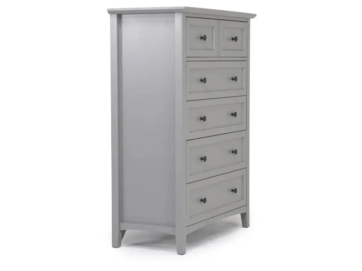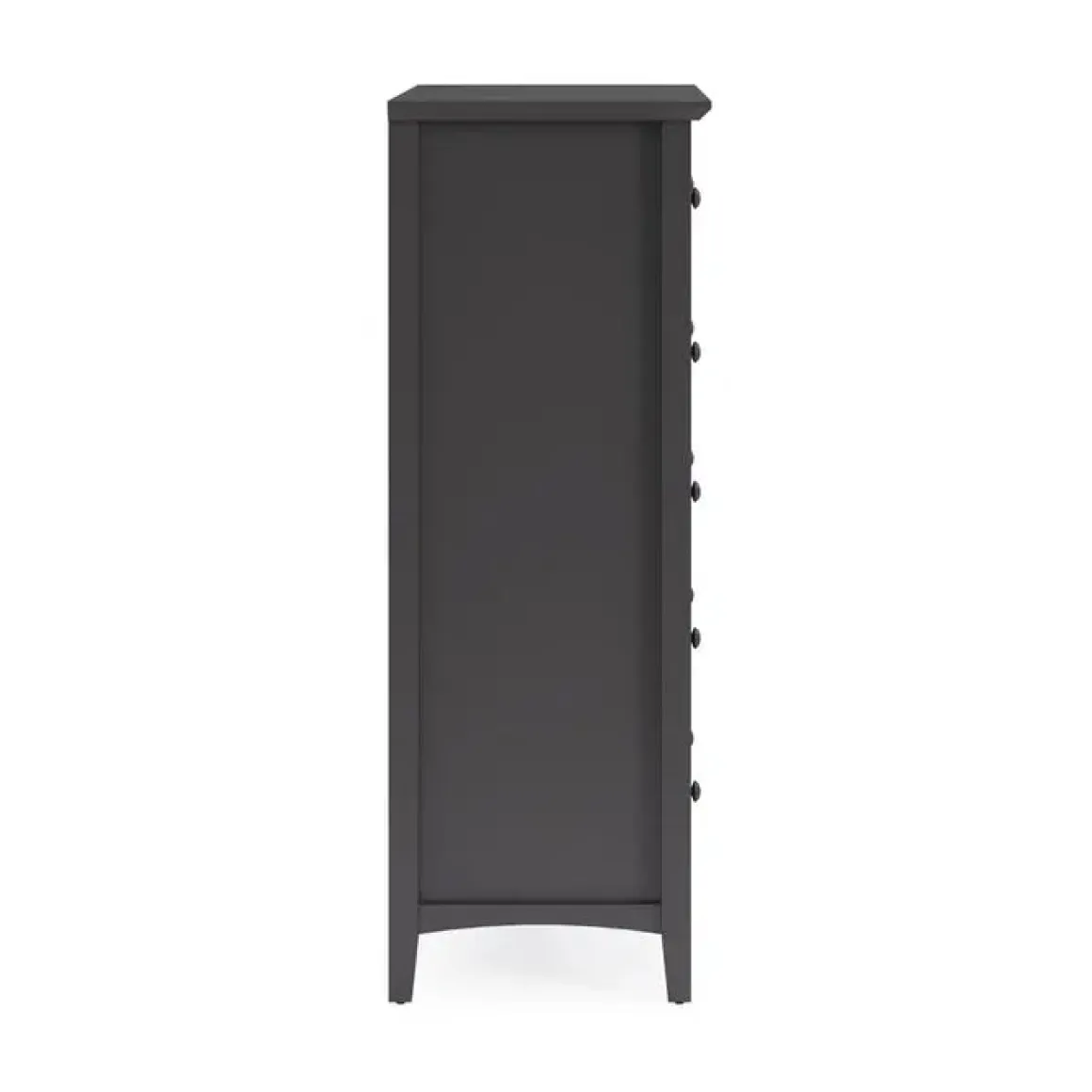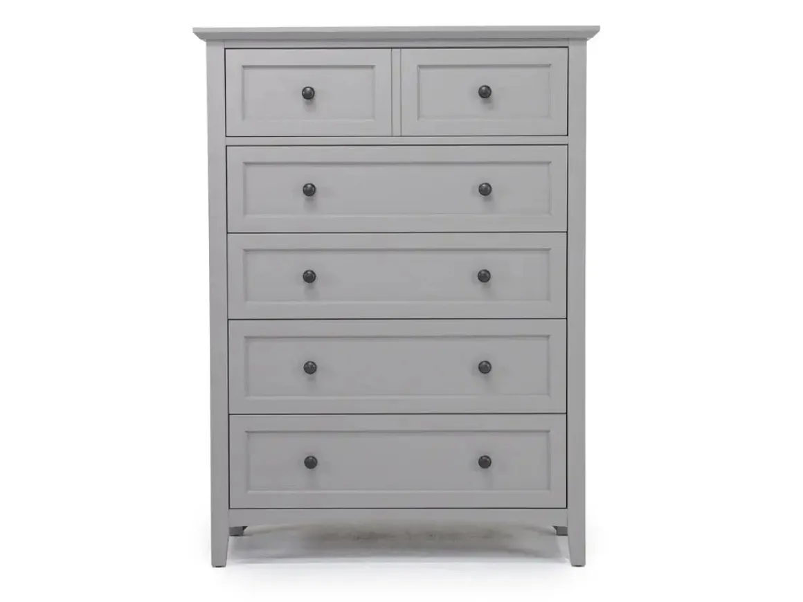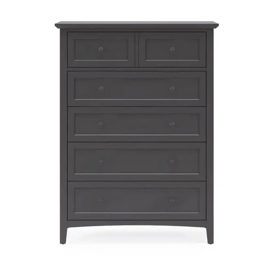 Boasting classic shaker-style drawer fronts, the Grace Chest in Elephant Gray is a timeless piece that combines crisp lines and an elephant gray finish that creates a unique style that blends well with a variety of decor styles, from modern to farmhouse and everything in between. This five-drawer bedroom chest boasts gently tapered legs, beveled floating tops, and smooth black hardware to finish the look.