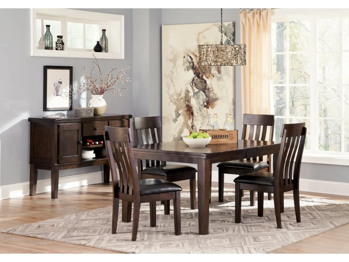 Take clean-lined, classic styling. Add modern comfort. Top with a deep, complex finish that exudes rich sophistication. That’s the look and feel of the Haddigan dining table set with built-in butterfly leaf extension to accommodate guests. Four rake-back upholstered chairs make it complete.