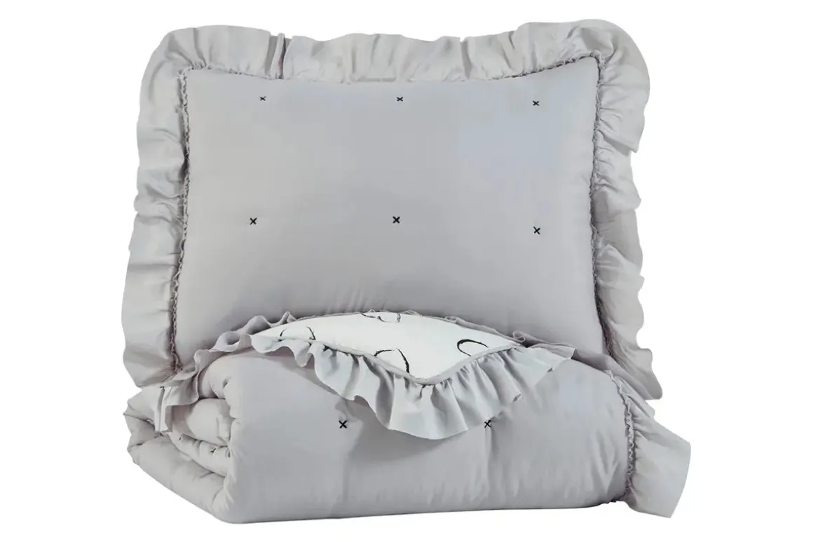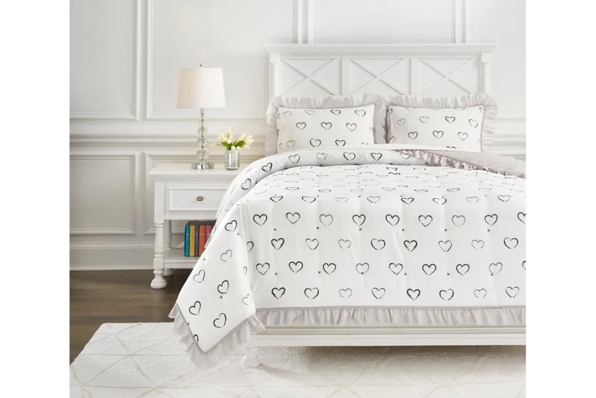 Refresh and update the look of your room in one fell swoop! Finish your room with a Hartlen 2 Piece Coverlet Set, Twin and make the whole place look new. Fully reversible in gray and white with a solid color side and a patterned side featuring sweet repeating hearts. Change up your look with a swish of the coverlet and Bam! It looks like a new set. You’ll always have a set to match your style.