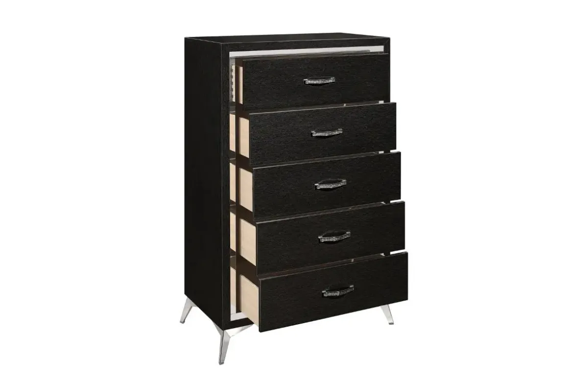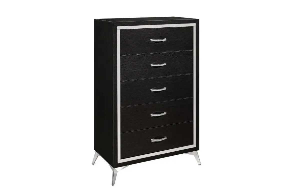 Enjoy the convenience of organized storage with this beautifully crafted Huxley Chest in Black. The five spacious drawers offer generous storage for your essentials, while the full extension glides ensure smooth and easy access. The chest’s sturdy wood frame and elegant tapered metal legs create a strong and attractive base. Its gorgeous black color blends well with most decor schemes. Keep it looking its best by wiping it clean with a dry cloth. Product Details: • Constructed with solid wood • Five spacious drawers provide ample storage for all your essentials • Easy to maintain – simply wipe clean with a dry cloth