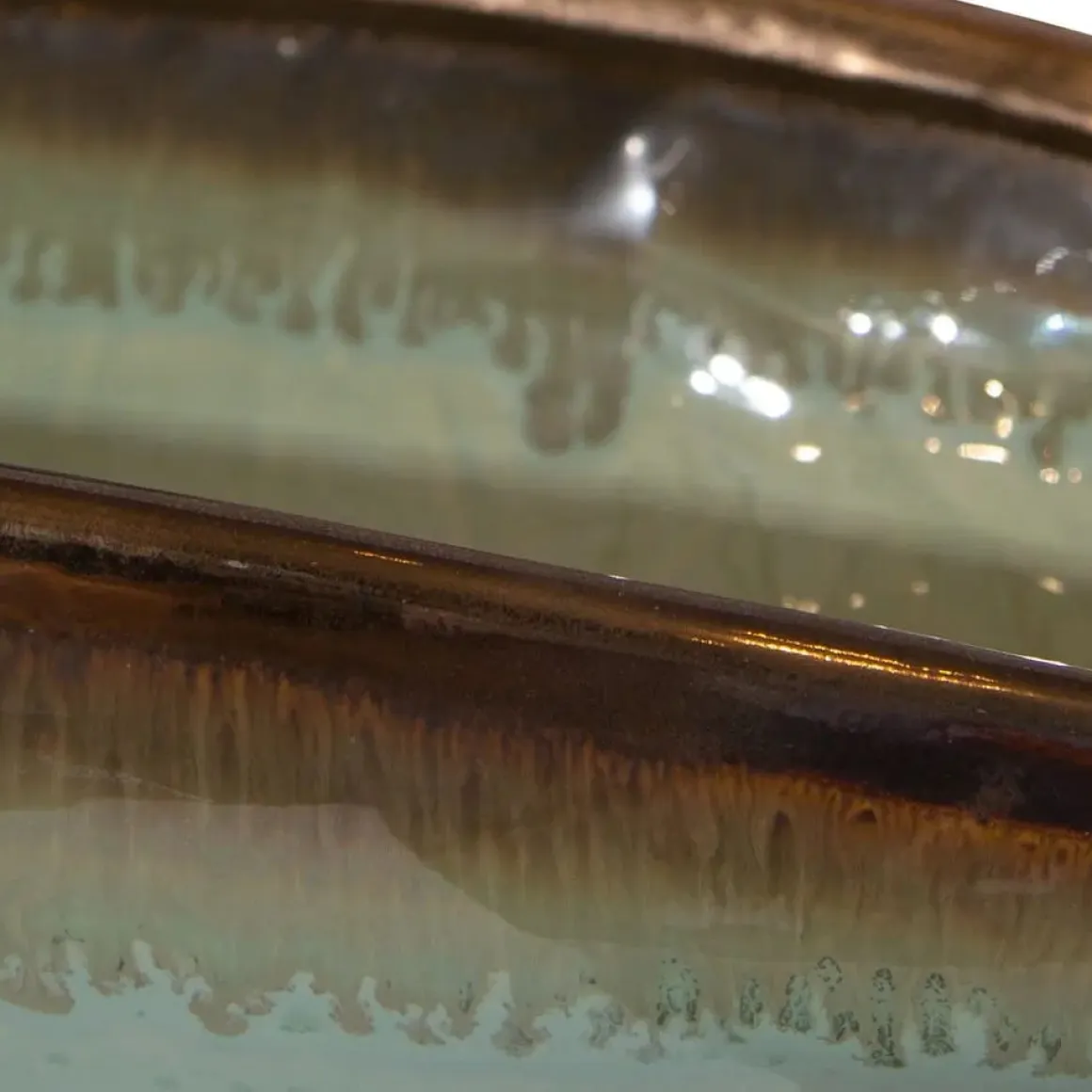 Earthenware bowl is finished in a calming mint green glaze with aqua blue details and accented by a ombre style chocolate brown glaze on the rim. Safe for outdoor use, but protection from freezing temperatures is recommended.