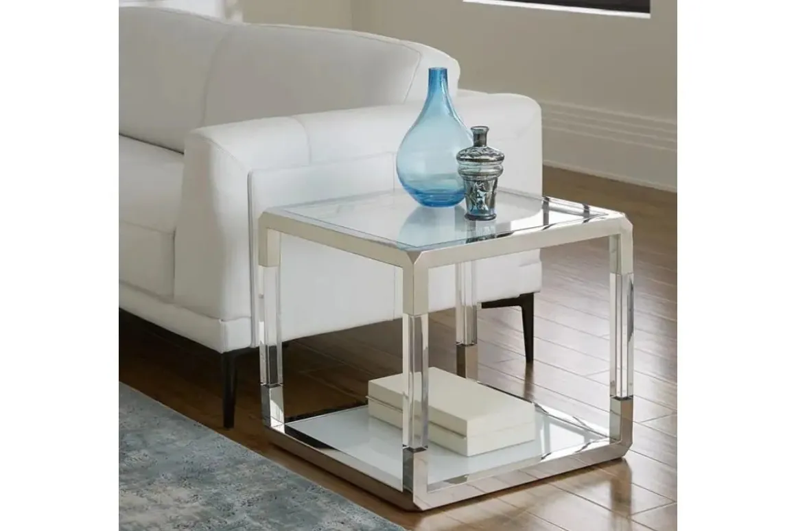 The Jasper End Table in Glass/Stainless Steel is an elegant and modern piece that will perfectly complement any living room decor. Crafted from high-quality glass, stainless steel, and acrylic, this table is both stylish and durable. The clear or white glass top is framed with a drop top design, making it practical and convenient for placing drinks or snacks. With its unique blend of materials, this end table will certainly be the center of attention in any space. Product Details: • The legs are straight and made of metal • The table’s natural finish adds a touch of class • Its trestle base is made from polished stainless steel