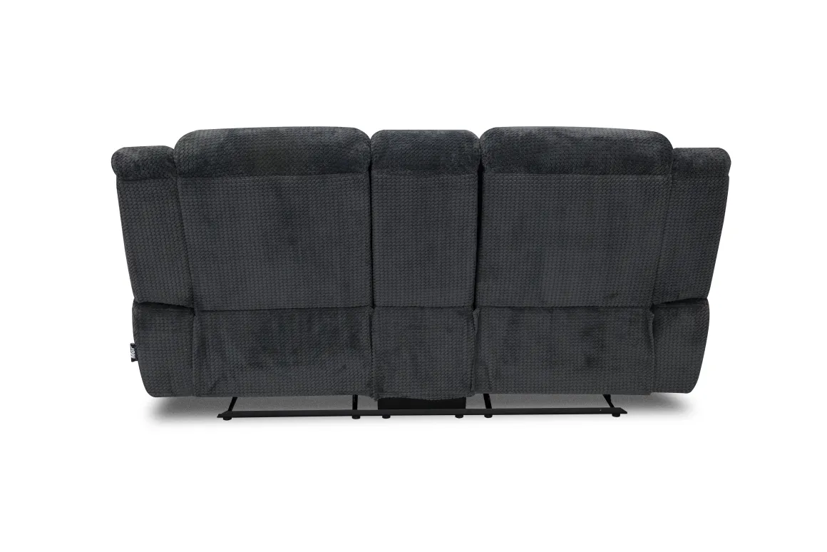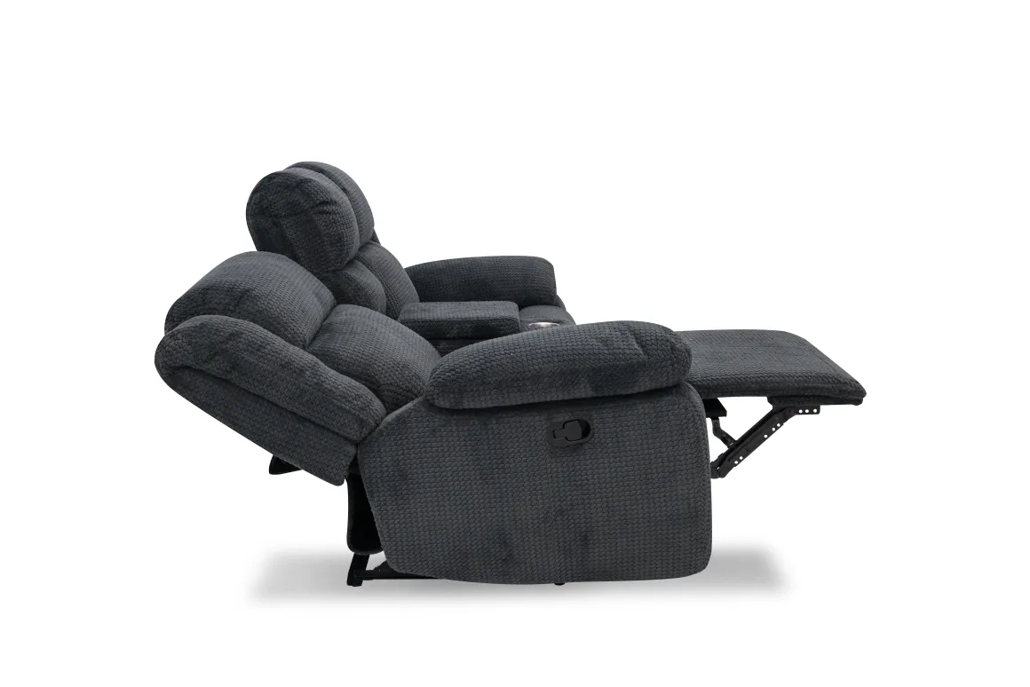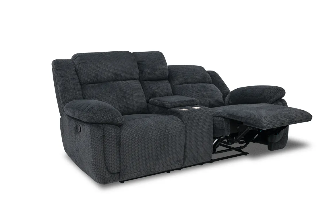 Elevate your lounging experience with the Jayne Reclining Console Loveseat in Charcoal. Its sleek, modern silhouette and deep charcoal upholstery bring a sophisticated touch to any living space while offering the ultimate in comfort. Two generously padded reclining seats invite you to relax, while the center console keeps essentials close with built-in storage and dual cup holders—perfect for movie nights or game-day gatherings. The durable fabric and smooth manual reclining mechanism make this loveseat a practical choice for families who value both style and function. Pair it with contemporary decor for a chic, cozy vibe.