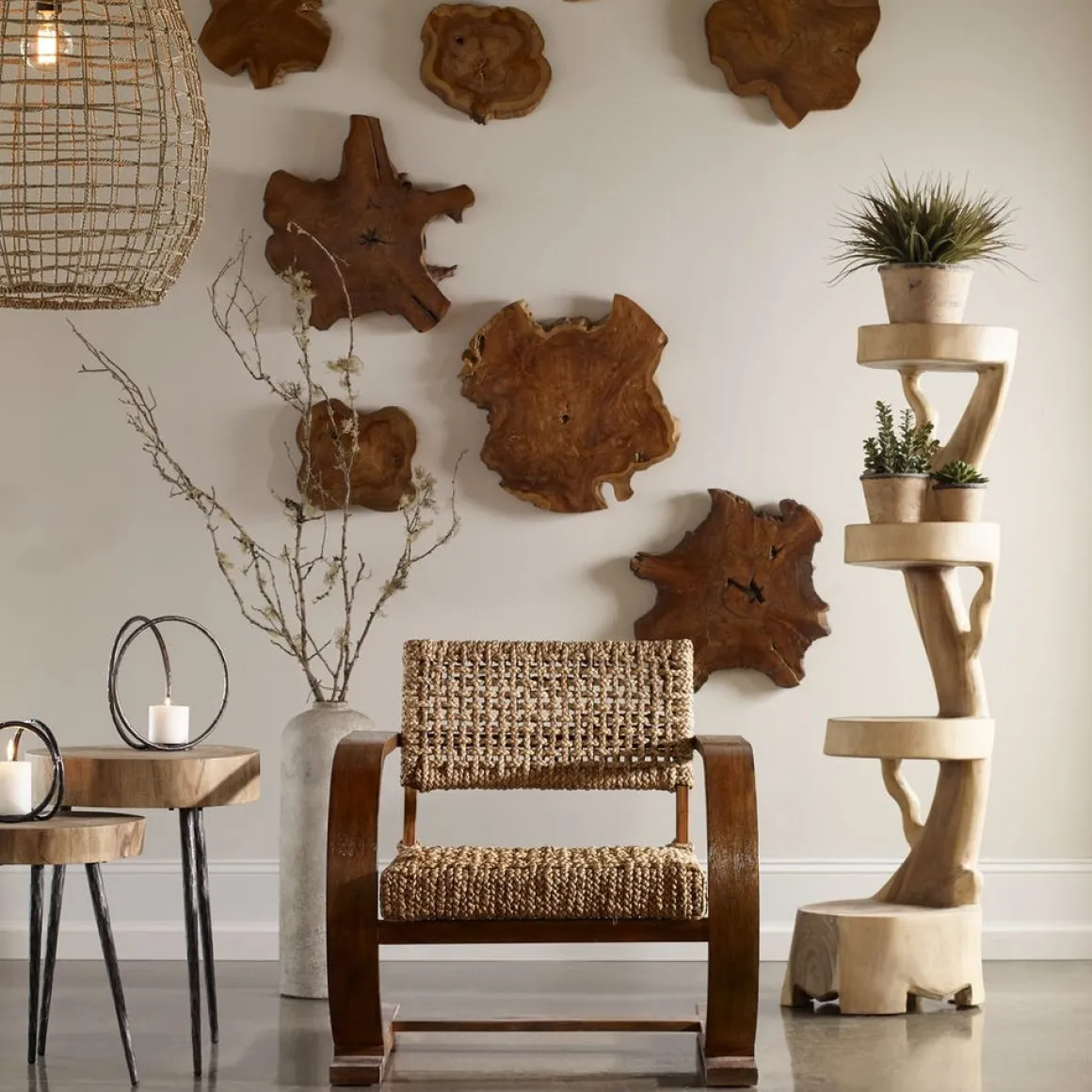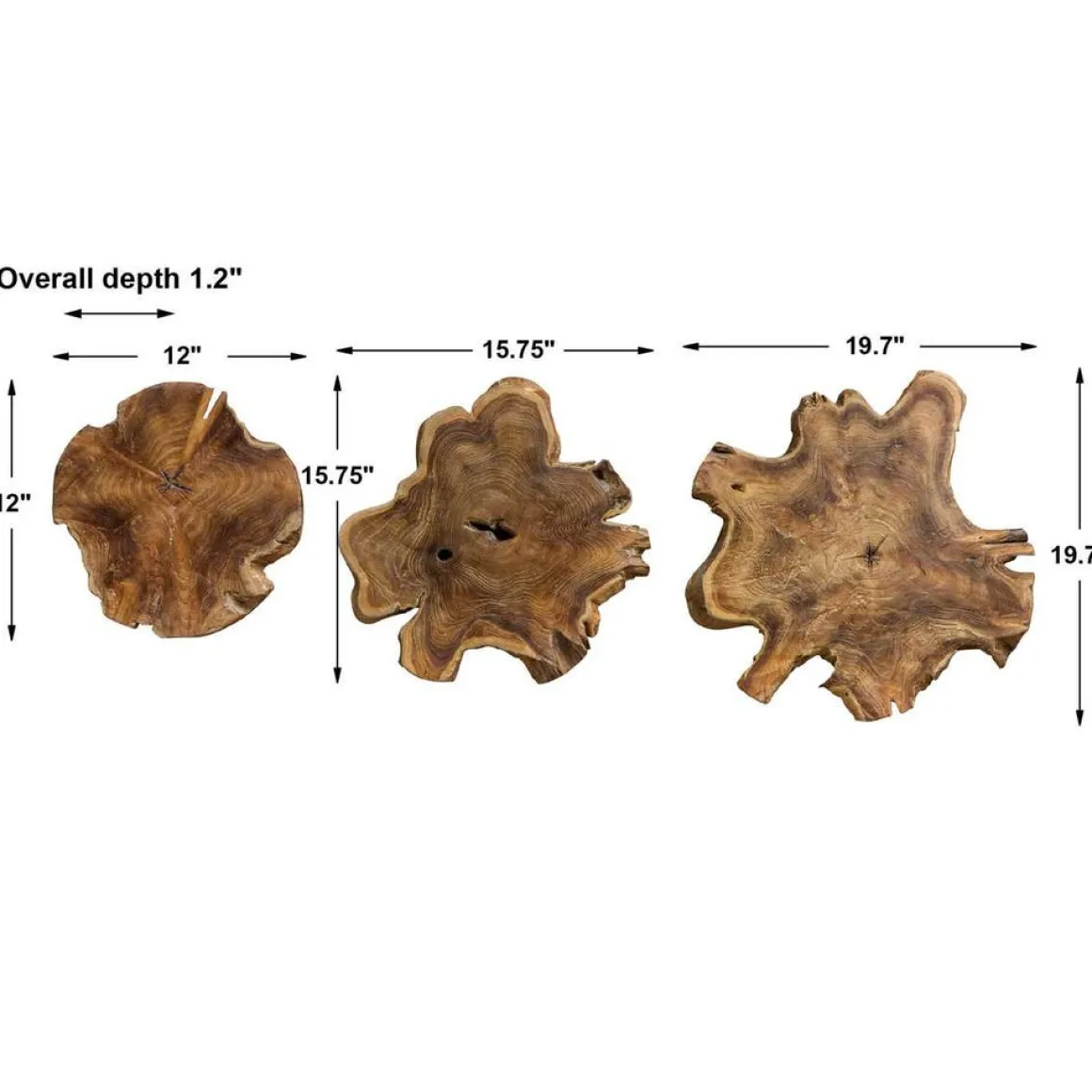 Deeply grained cross sections of natural teak wood with a light, bleached finish. Panels may be hung or used as tabletop accessories.