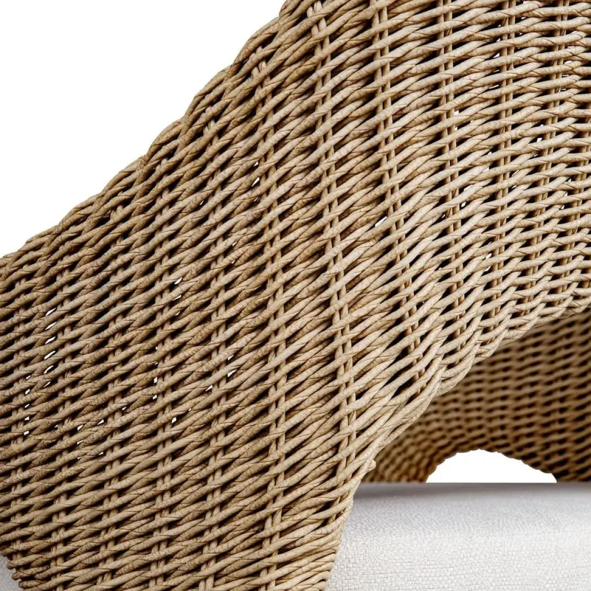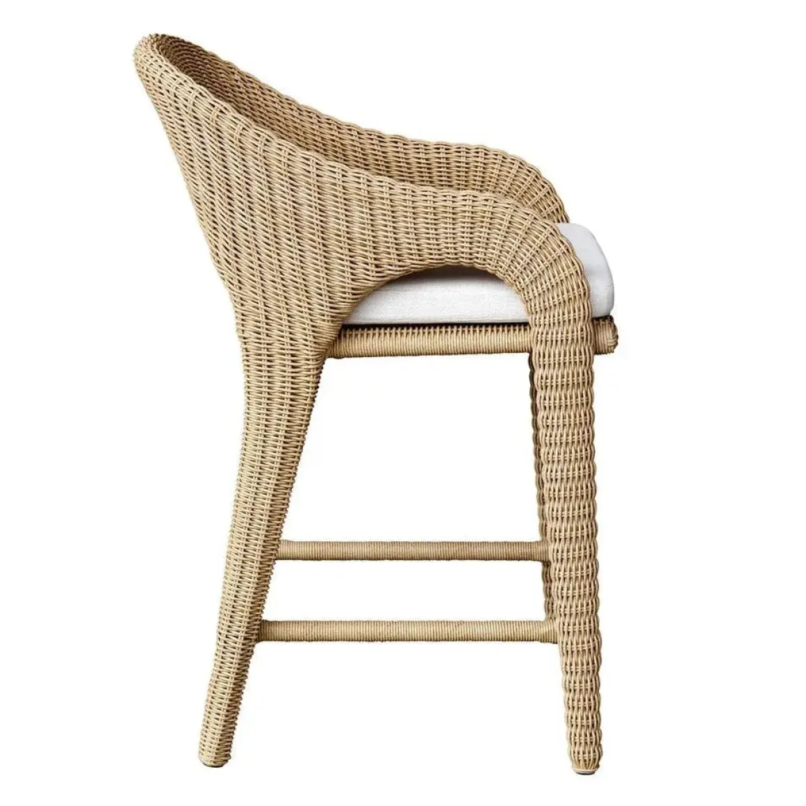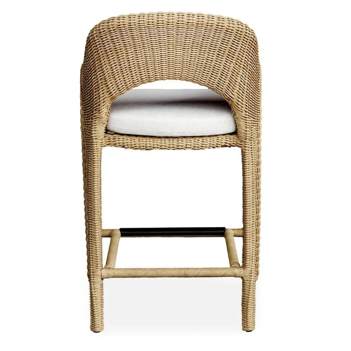 The Kavali Counter Stool showcases a curvaceous frame, crafted from hand wrapped, all-weather wicker in a natural honey finish. The plush cushion is upholstered in oyster white solution dyed acrylic fabric that is constructed to withstand the moisture and dirt that comes with outdoor use.