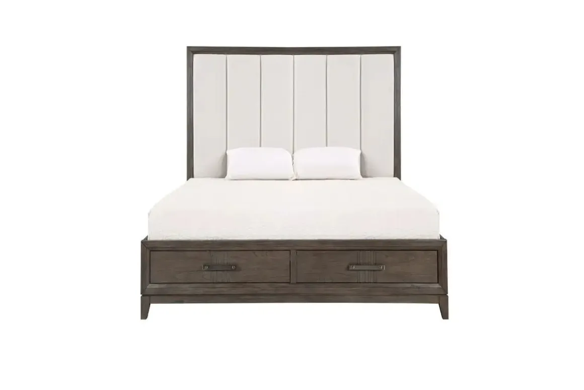 Experience supreme comfort with the Landon Upholstered Panel Bed in Walnut, Queen. The panel headboard adds a touch of class, while the two drawers in the panel storage footboard provide convenient extra storage space for your linens or clothes. With bun-style legs and fabric upholstery, this bed combines style and functionality effortlessly. Its queen size offers ample sleeping space, making it an ideal choice for your bedroom sanctuary. Product Details: • Crafted from solid wood in a rich walnut finish • Bun-style legs add a charming touch to the overall design • Fabric upholstered bed frame provides comfort and style