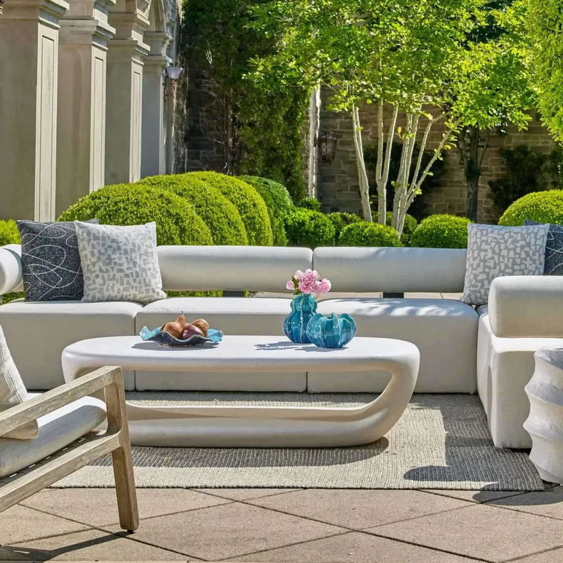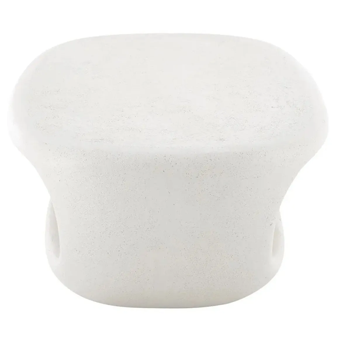 Made from glass reinforced concrete in a smooth warm white finish, this coffee table boasts a bold silhouette which incorporates a hollow center, providing ample storage. Suitable for both indoor and outdoor use.