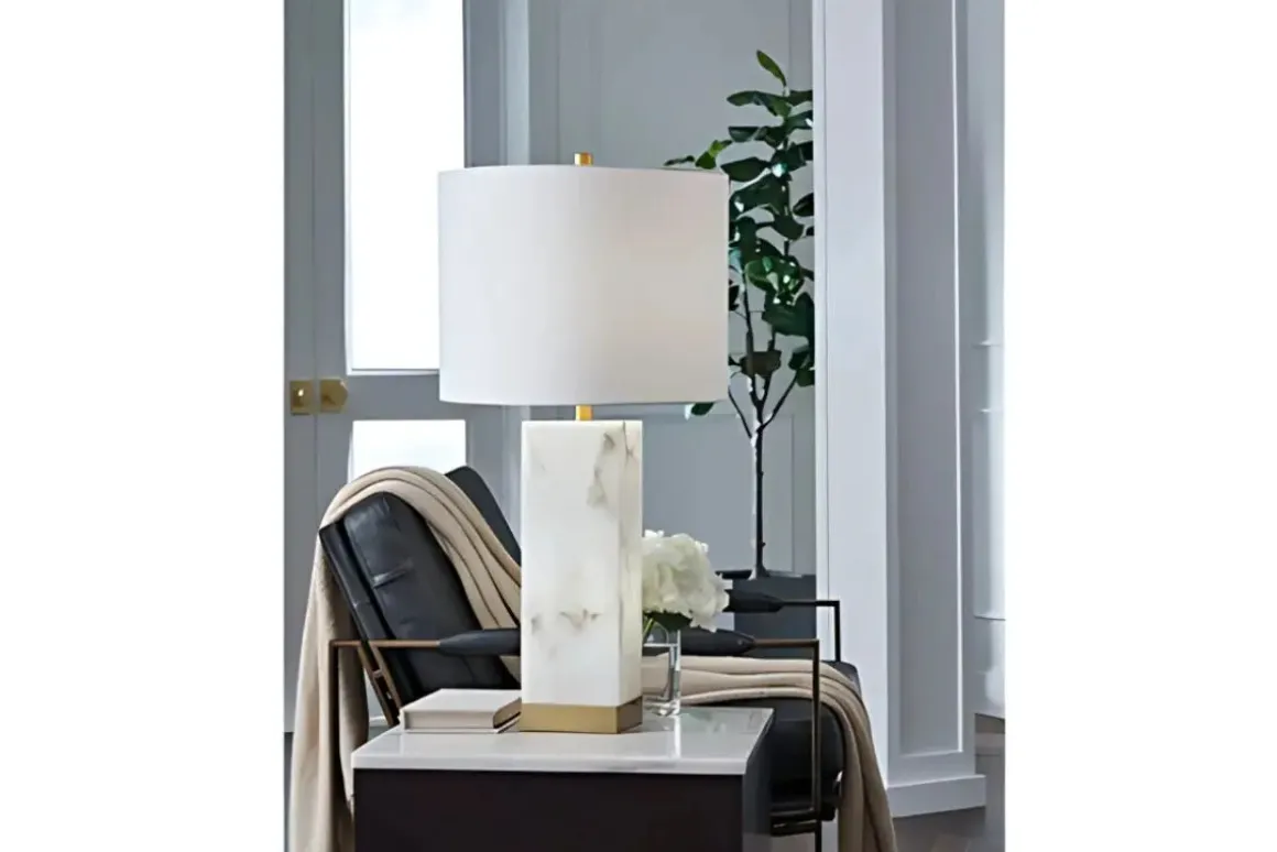 The grandeur and timeless beauty of the contemporary Linderfield table lamp make it an instant focal point. Made of alabaster with rich goldtone metal accents, this piece makes a style statement whether it’s sitting pretty atop an end table or flanking the sofa.
