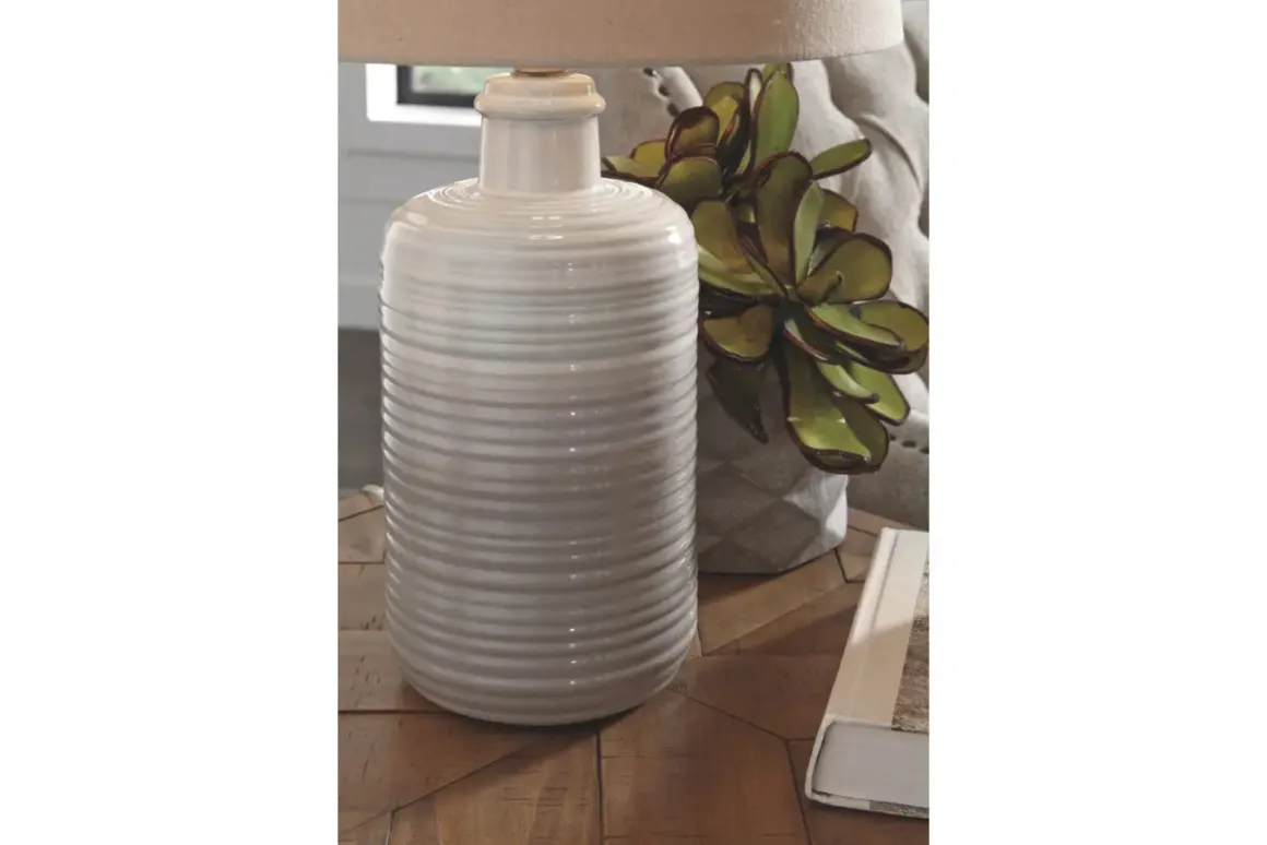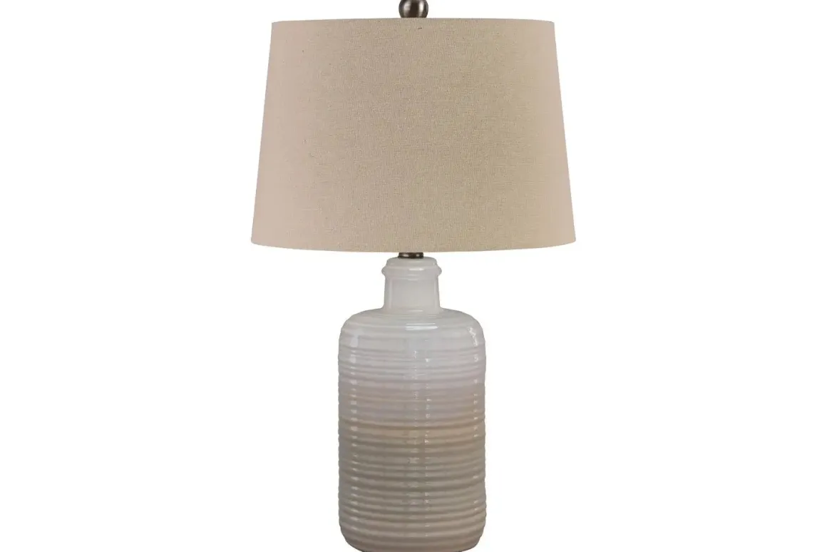 Wowing with shades of taupe and white, the Marnina Table Lamp in Taupe lights up our world. The glazed, textural base encompasses casual-cool beauty beside any sofa or bed-what a well-rounded pair.Product Details:• Made of white and taupe glazed ceramic with modified drum shade• 3-way switch• 1 type A bulb (not included) 100 watts max or CFL 23 watts max; UL Listed• Clean with a soft, dry cloth• Assembly requiredDimensions: • Overall: 14”W x 14”D x 25”H• Base: 6.25”W x 6.25”D x 18”H• Cord length: 94” • Shade: 14”W x 14”D x 9.5”H