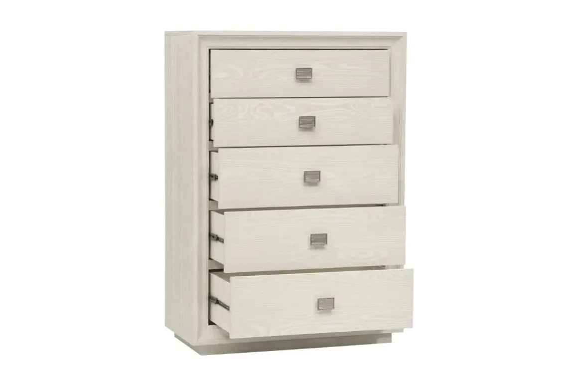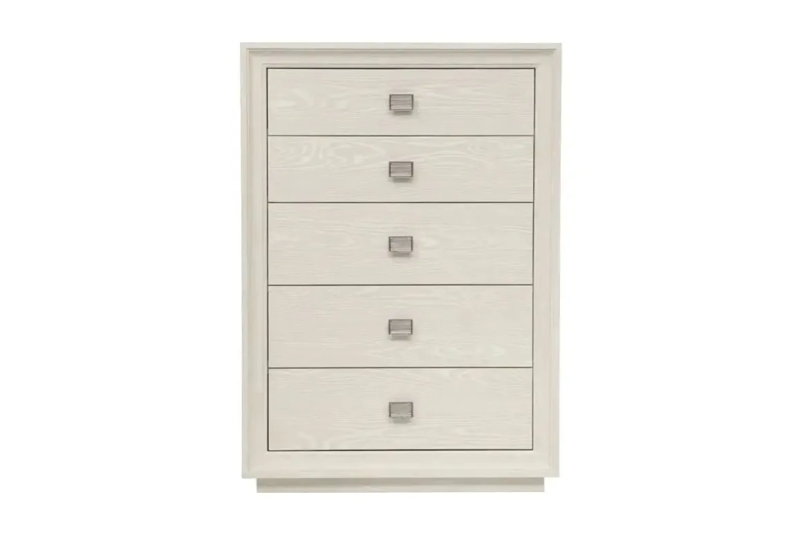 The Maxime Chest in Sugar blends a crisp modern silhouette with traditional picture frame moldings and jewel-like, custom molded metal pulls. Made from a mix of quartered and flat cut Ash wood veneer and meranti solid wood, the proprietary Sugar finish showcases the wood‘s active grain with a beige base and a soft white powder glaze resting on top.