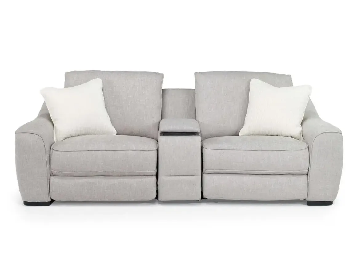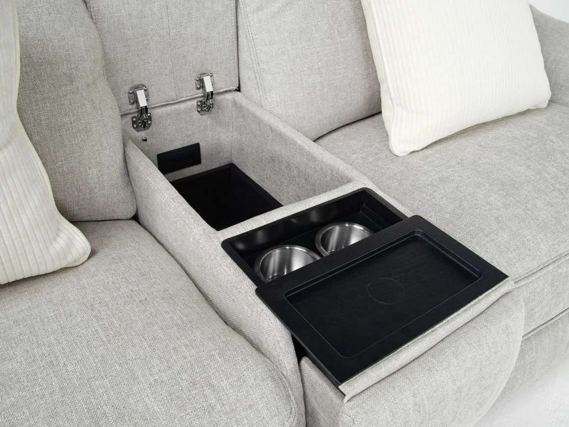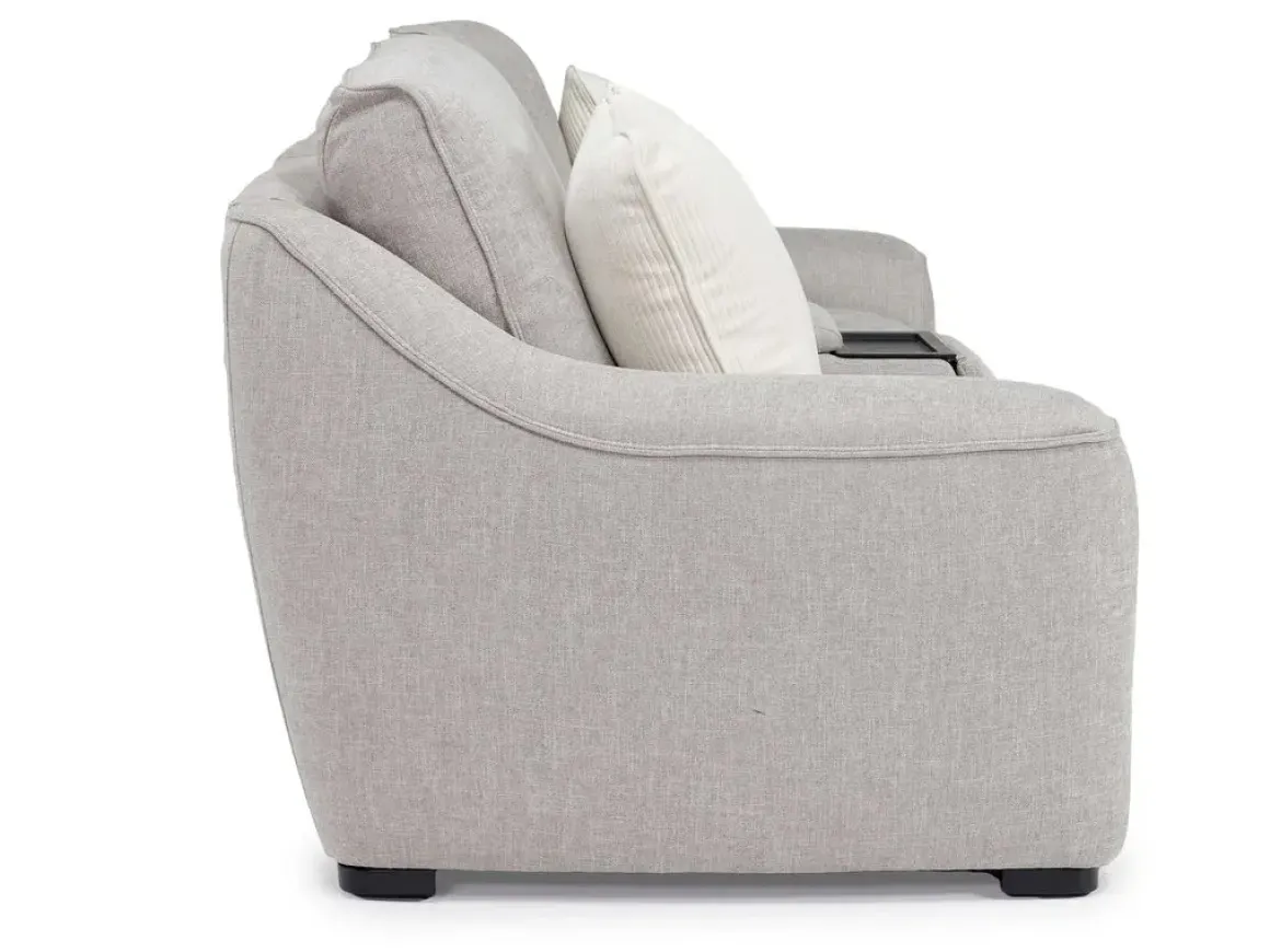 Enhance your relaxation with the Mayflower 2 Power Console Loveseat in Ashland Sand. This loveseat offers dual power reclining seats and a convenient center Audio console with cupholders, a speaker and USB ports. The plush fabric upholstery and down alternative seat composition ensure a comfortable and stylish seating experience.