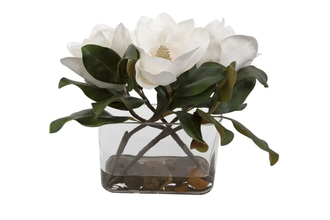 If you are looking for a simple yet eye-catching piece to add to your home decor, look no further than the Middleton Magnolia Plant in Multi. This realistic plant features white flower pedals with dark green leaves, bringing a touch of elegance and sophistication to any room. Product Details: • Measures 7 inches in height and 17 inches in width • Simple but stunning design brings nature and relaxation into your home • Does not require any maintenance as it is made from high-quality silk.