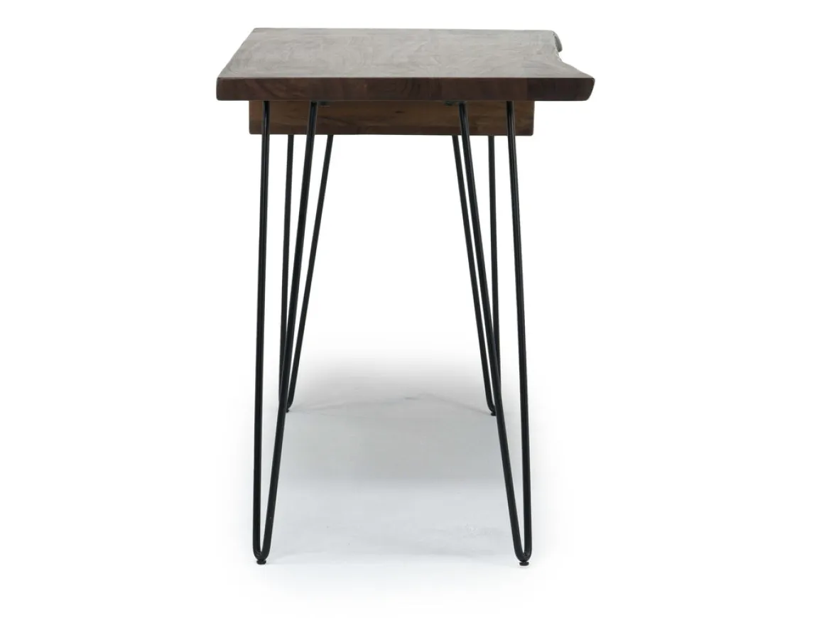 Elevate your home office with the superb Natures Edge Office Desk in Chestnut. This desk seamlessly blends modern functionality with the timeless appeal of natural wood, creating a workspace that inspires productivity and reflects your style. The warm chestnut finish showcases the wood’s natural grain, creating a beautiful and inviting atmosphere, while the solid acacia wood construction ensures stability. Product Details: • One-of-a-kind living edge design adds individuality and makes each desk a conversation starter • Integrated drawer offers ample interior space to help you keep your office supplies organized and easily accessible • The sleek hairpin legs provide sturdy support and a touch of modern sophistication