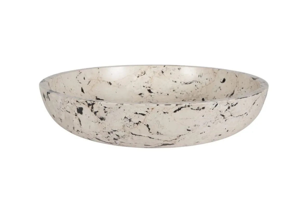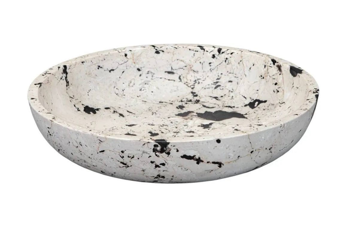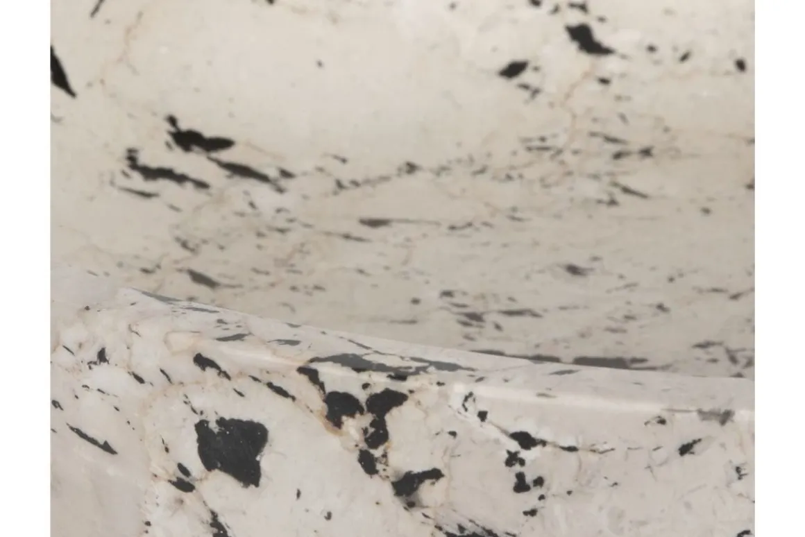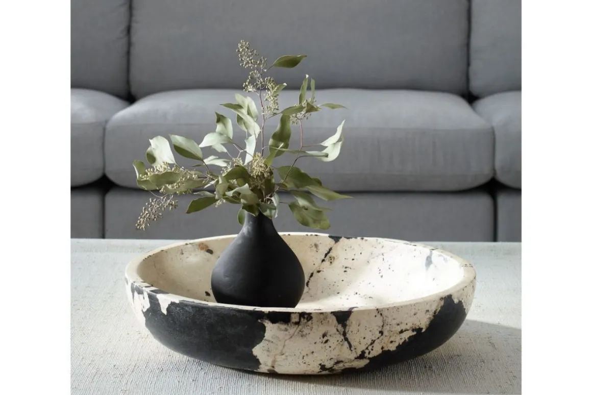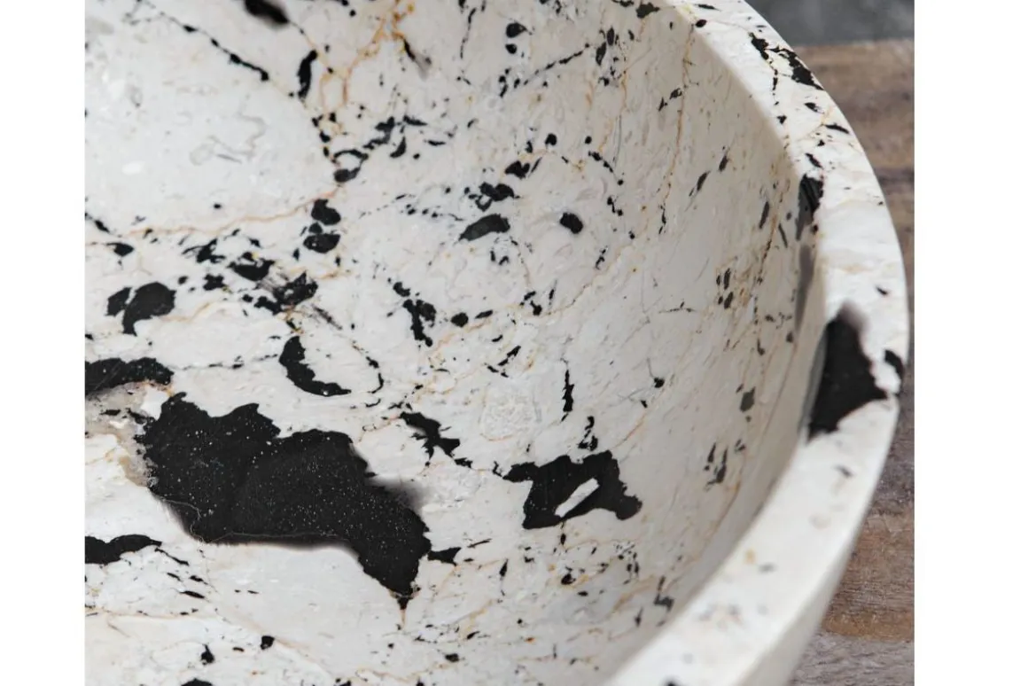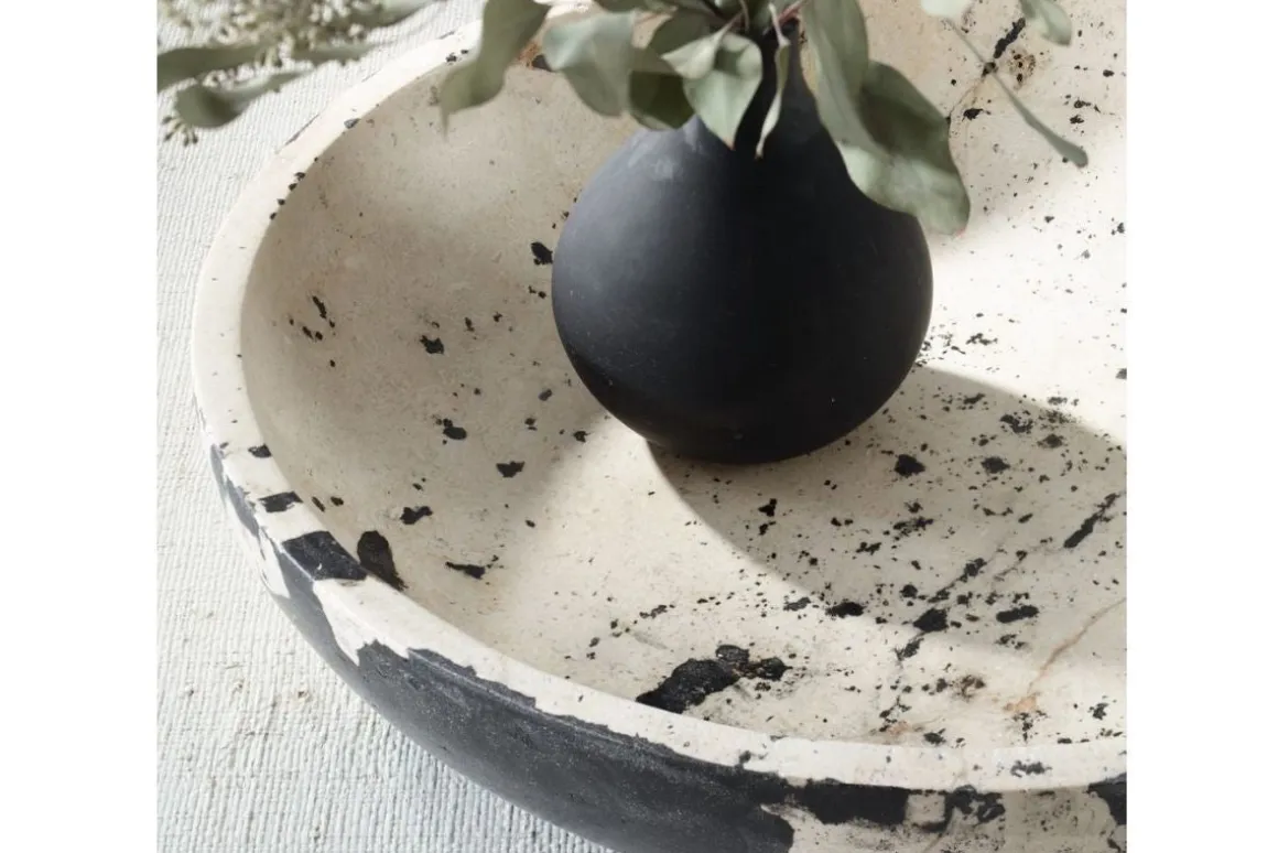 Inspired by the clean lines and bold feel of modern art, this bowl is handcrafted from natural white limestone with black accents. The contrast between the smooth stone and bold detailing highlights the artisan craftsmanship, making it a statement piece for any space. Safe for outdoor use, but protection from freezing temperatures is recommended.