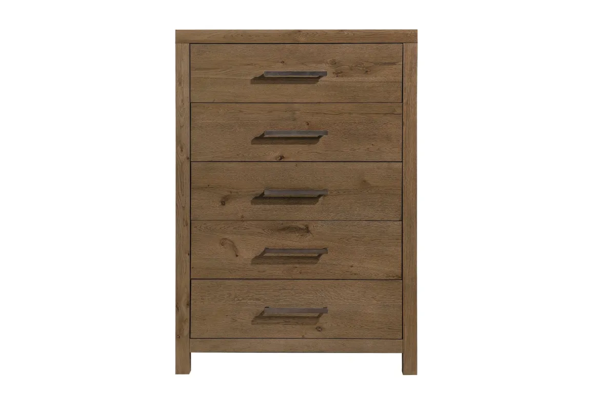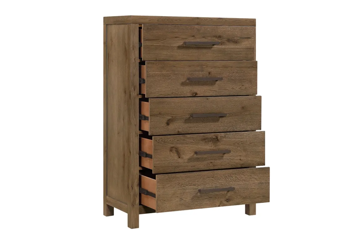 The Oaklyn Chest in Brown brings warm, timeless character to any bedroom with its clean transitional silhouette and beautifully grained oak finish. Crafted with a sturdy wood frame, this chest delivers lasting quality the whole family can count on. Smooth, side‑mounted ball‑bearing glides make every drawer easy to access—perfect for busy mornings or keeping everything neatly organized. French dovetail drawer construction adds strength where it matters most, giving you dependable storage that stands up to everyday living. With its simple lines, dark metal pulls, and natural wood texture, the Oaklyn Chest fits effortlessly into modern, rustic, or classic decor, making it a smart and stylish addition to your home.