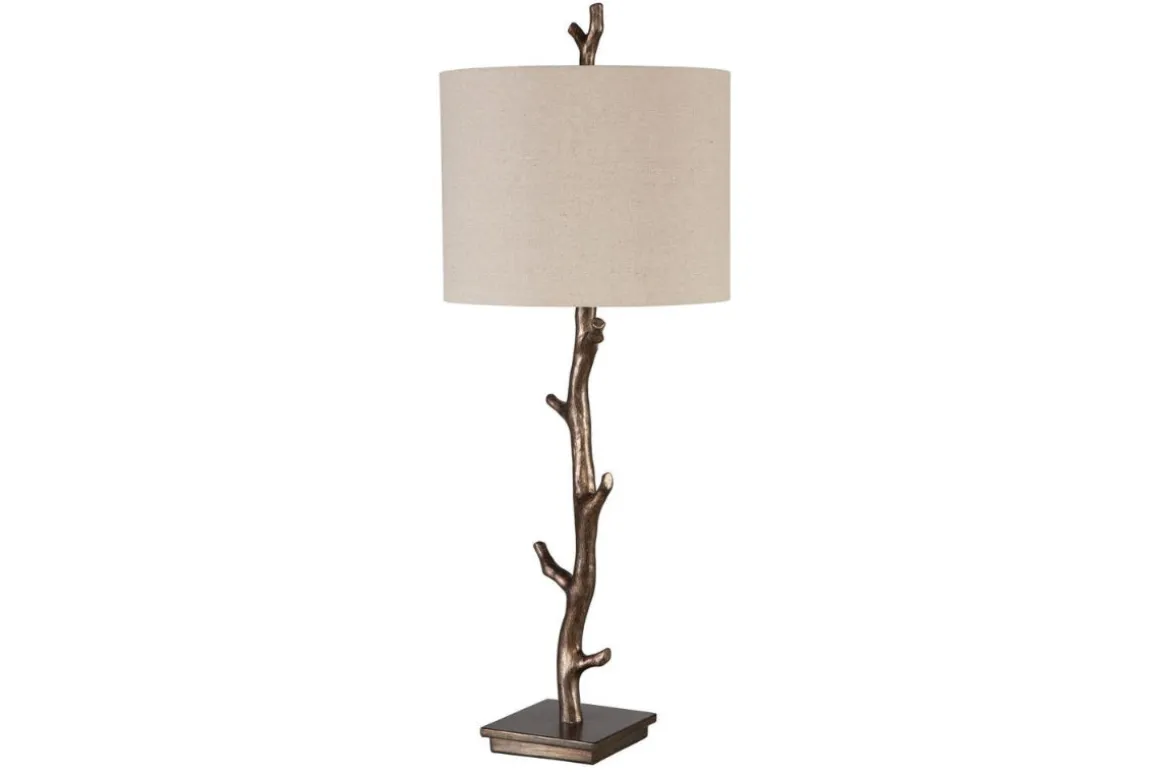 Resembling a tree branch, this rustic table lamp is finished in a dark bronze with gold undertones. The oatmeal linen shade has natural light slubbing.
