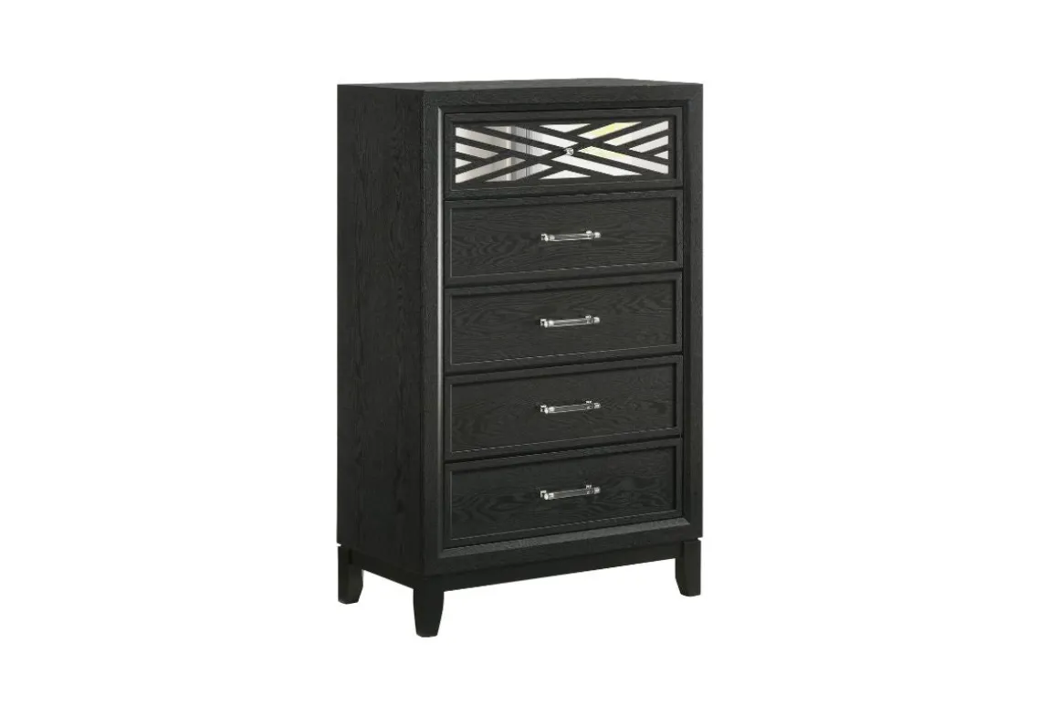 Add a touch of modern sophistication to your bedroom with the Obsidian Chest in Black. This stylish chest combines elegance and functionality, making it a perfect fit for any contemporary bedroom. Constructed from solid rubberwood, it features five drawers that provide ample storage space for clothes, linens, or other bedroom essentials. Product Details: • Kenlin drawer glides offer a smooth and effortless opening and closing experience • English dovetail drawer construction delivers increased sturdiness and support • A sleek black finish with finished drawer sides exudes a modern and sophisticated look