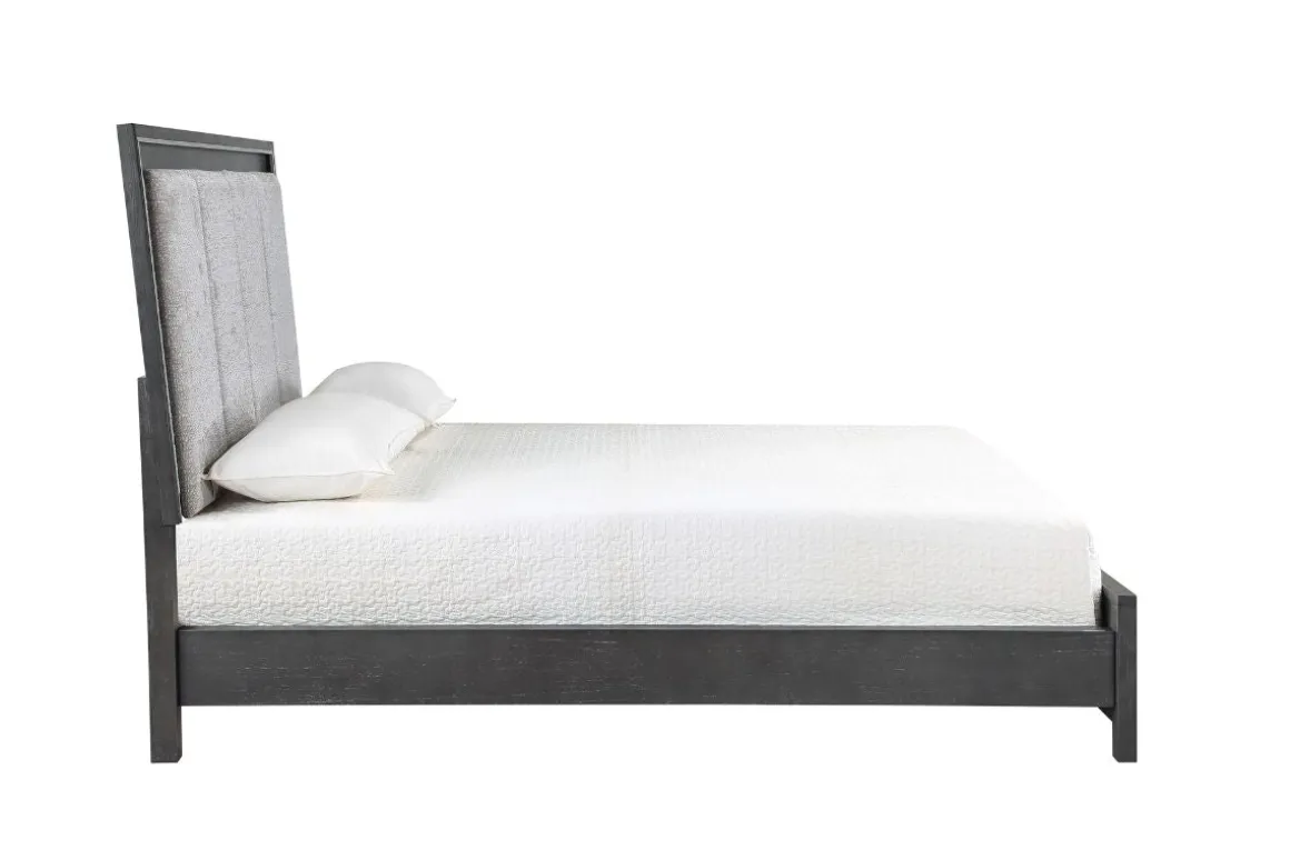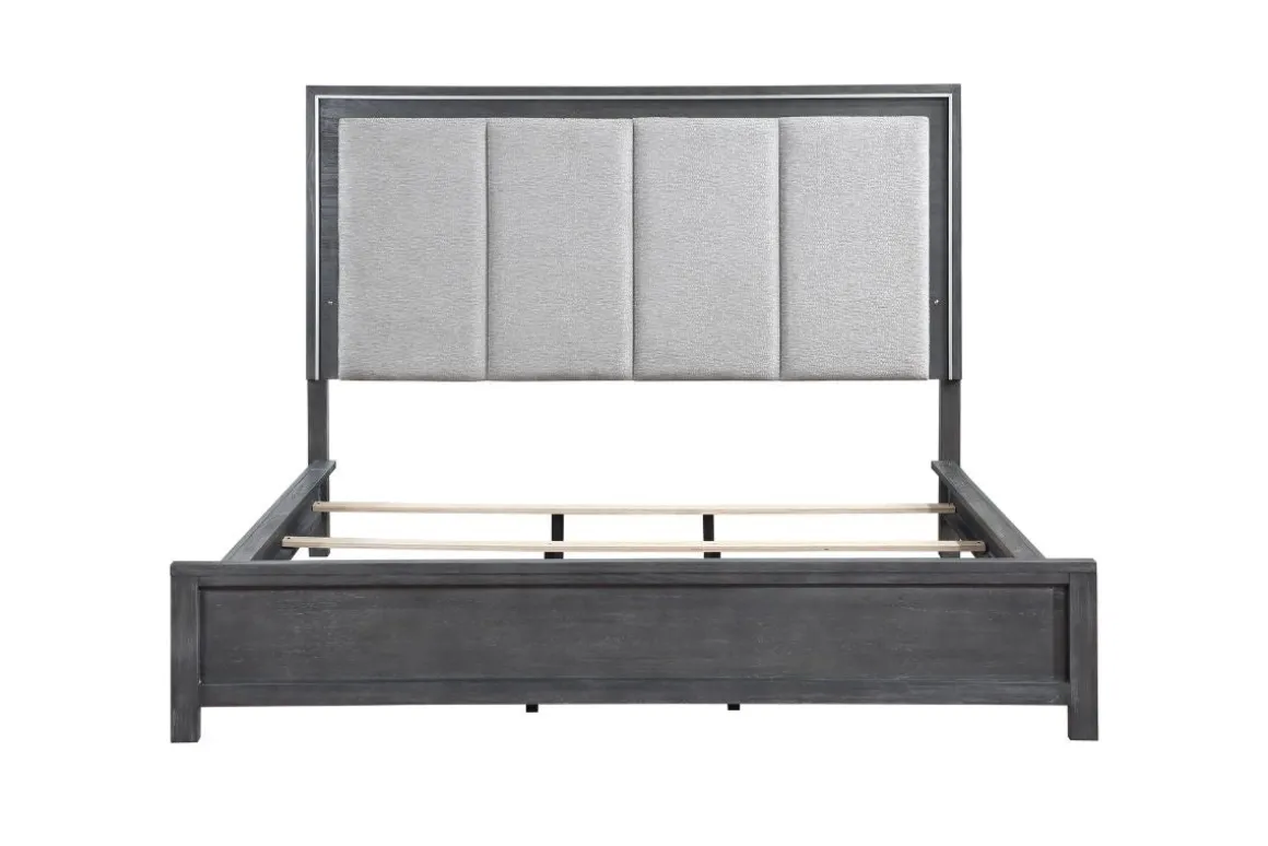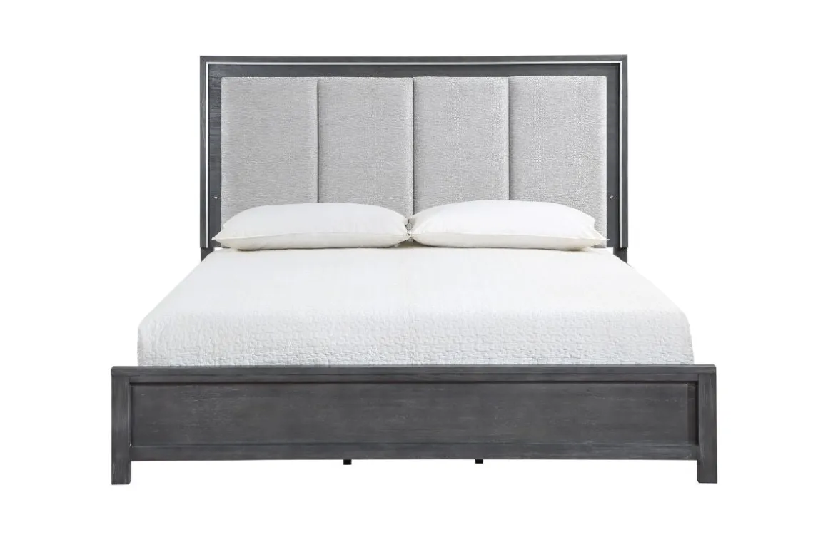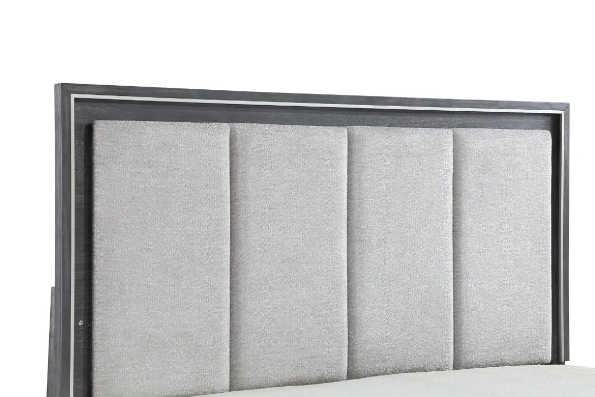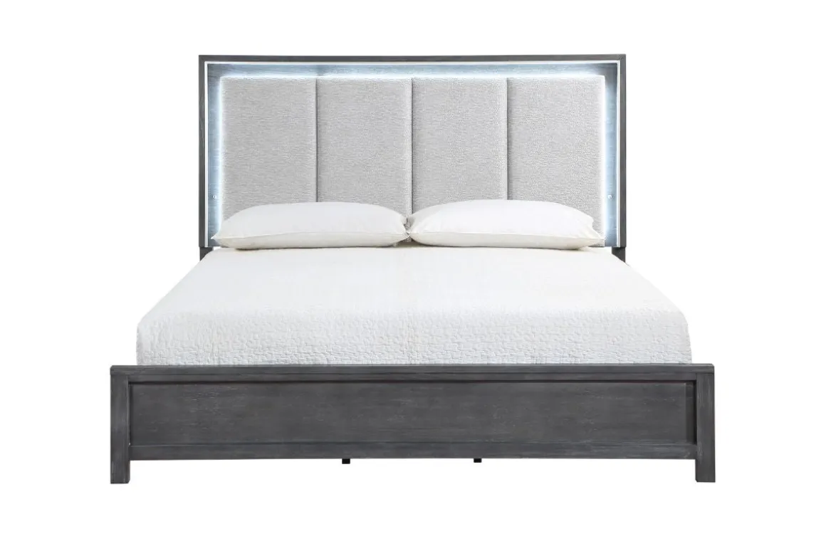 The Odessa Panel Bed in Charcoal, Queen is the ideal combination of contemporary design and comfort for your bedroom. This bed has a modern charm thanks to its panel design and sleek charcoal color. It will instantly improve the atmosphere of your space. The silver trim adds a touch of class while the padded headboard provides maximum comfort. Your room will have a stunning focal point thanks to the soft, inviting glow of the integrated LED lighting.
