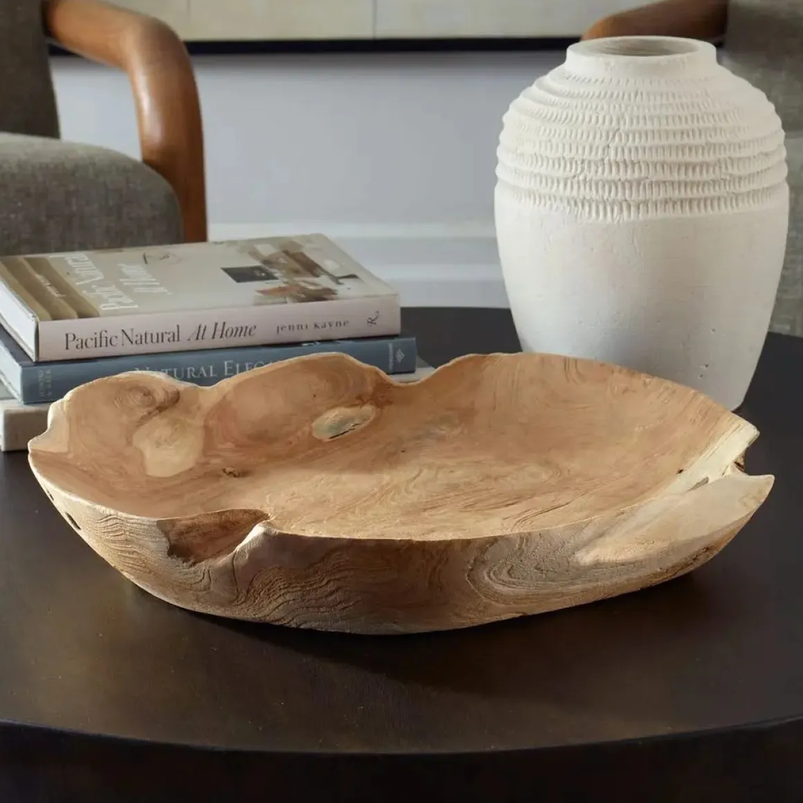 Embrace the raw beauty of nature with this handcrafted teak wood bowl. Featuring an organic, live-edge design, each piece is uniquely shaped by the tree’s natural form. This bowl brings warmth, character, and timeless elegance to any space. Because each is individually handcrafted, natural variation will occur from piece to piece. Safe for outdoor use.