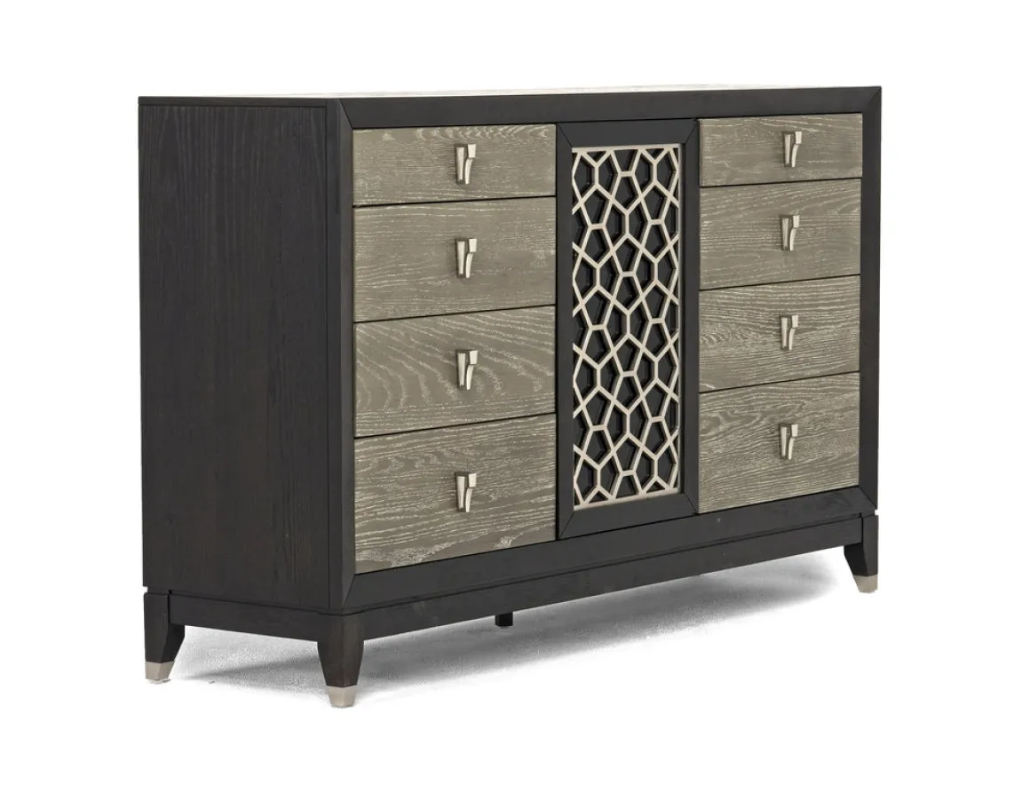 Elevate your bedroom’s storage and style with the Proximity Dresser in Gray Oak II. This modern dresser offers ample storage space and a touch of sophisticated elegance. Featuring eight drawers of varying sizes, it provides a perfect solution for organizing clothes, linens, and accessories. Product Details: • Clean lines and a sleek silhouette create a contemporary look • The warm gray oak finish with a subtle wood grain adds a touch of sophistication • Crafted with high-quality materials and expert construction