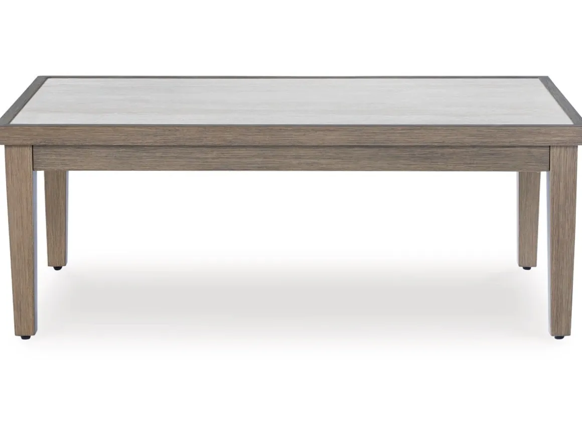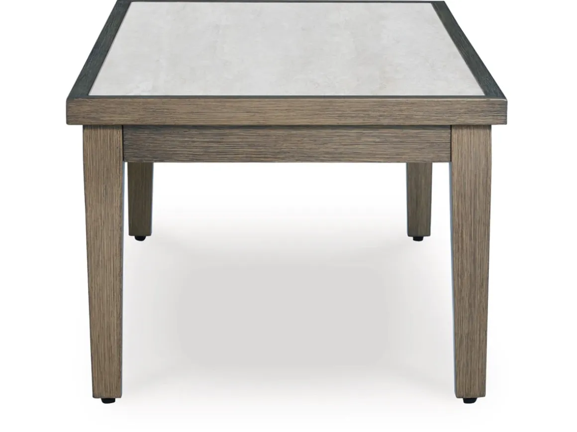 Experience the perfect combination of durability and style with the Rainier Outdoor Coffee Table in Brown/Beige. An aluminum frame with a wood-look finish maintains a sleek, contemporary aesthetic, while the sintered stone tabletop adds an element of natural elegance. This delightful addition to your outdoor dining creates an oasis where comfort and beauty thrive.