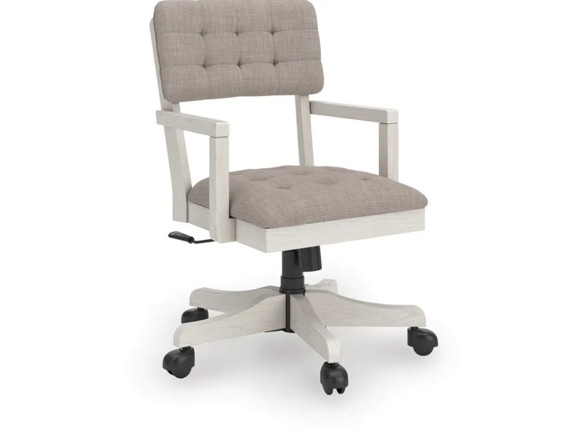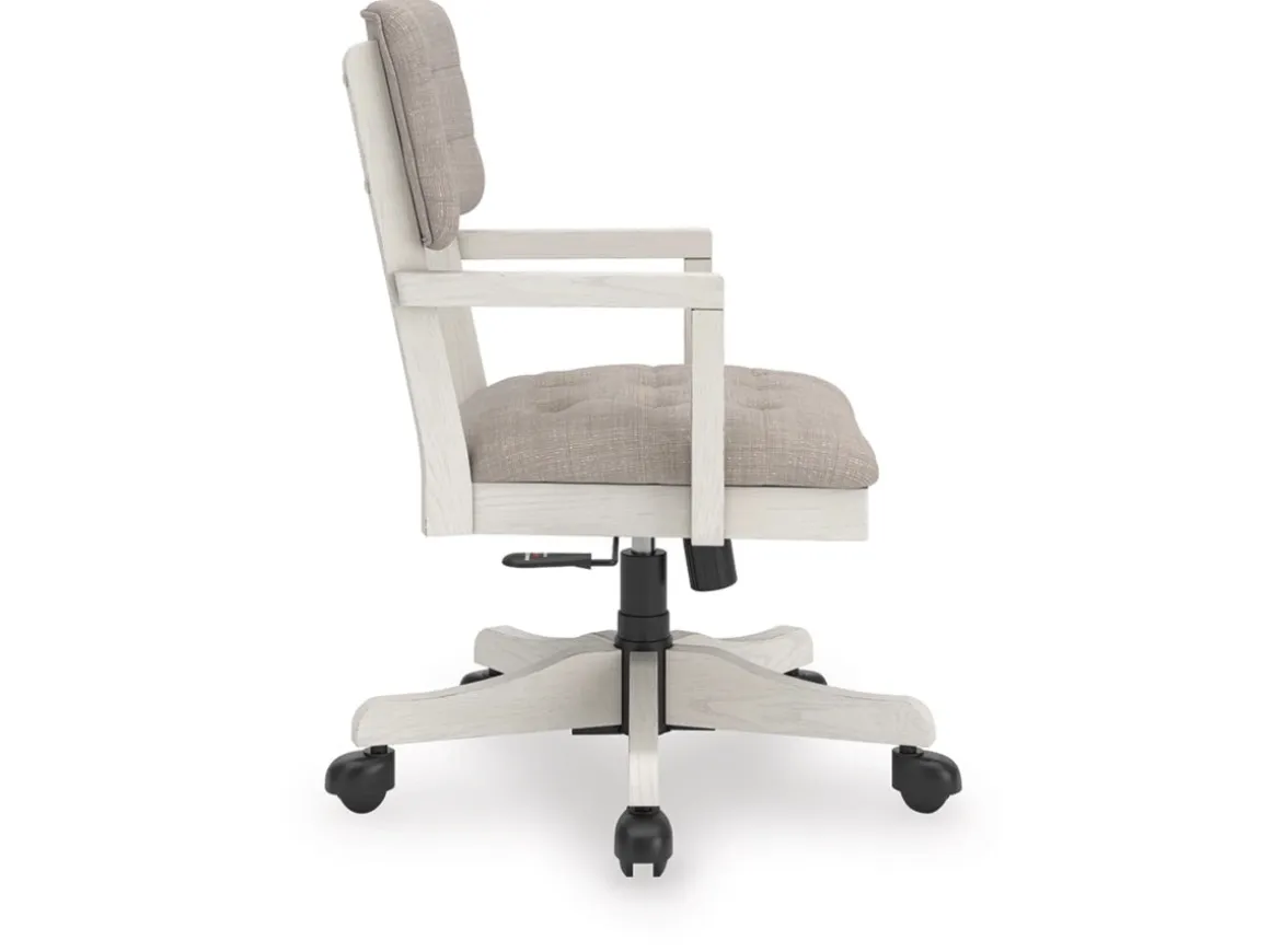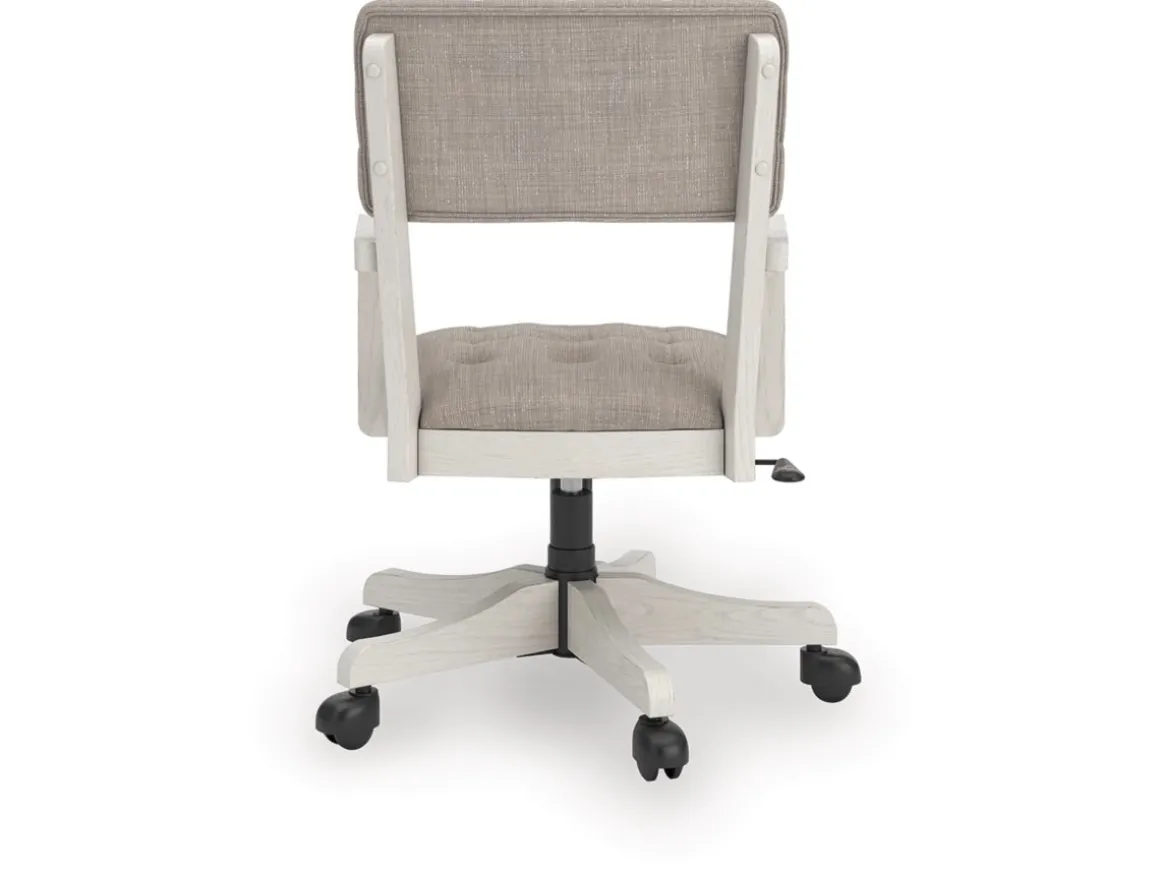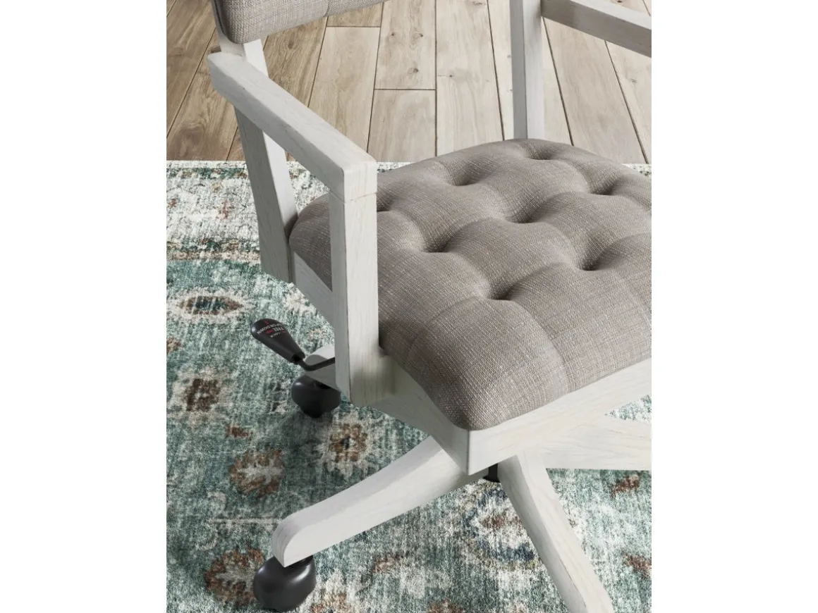 Bring classic charm and comfort to your home office with the Robbinsdale Desk Chair in Antique White. Featuring a weathered white finish and a tufted cushioned seat and back, this chair blends timeless style with everyday functionality. The adjustable height and smooth swivel base make it easy to customize your seating position, while rolling casters provide effortless mobility. Perfect for pairing with the Robbinsdale desk or any traditional workspace, this chair combines elegance, comfort, and practicality for a productive day in style.