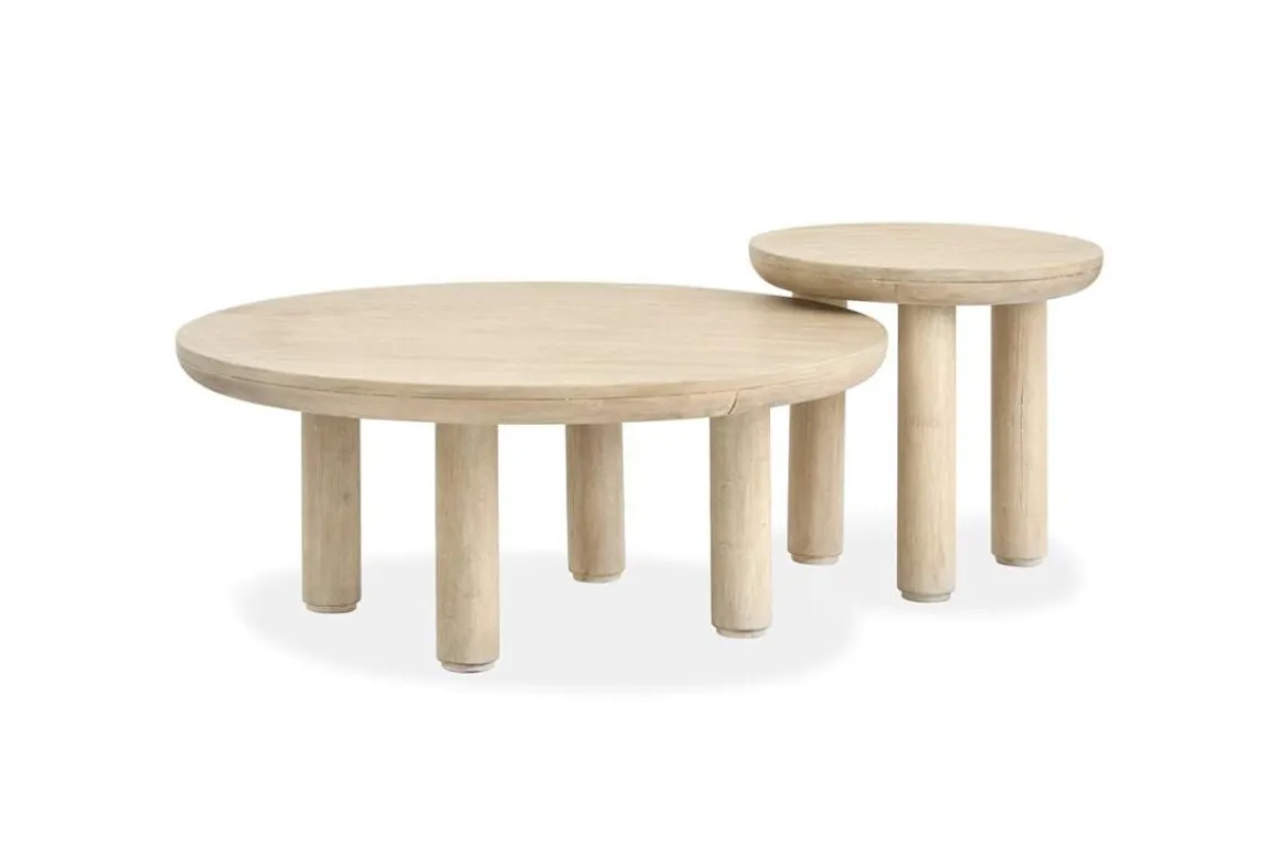 The Sunset Cove Nesting Coffee Tables in Sanibel Brown are both practical and chic, making them a must-have addition to your home. These versatile tables feature a transitional style that effortlessly blends with any decor. Crafted from hardwood solids and random cathedral flip/slip white oak veneer, the tables have a sturdy wood frame. The set includes one large round table with convenient casters and one round small table, perfect for entertaining or everyday use.Product Details:• Natural finish and a slab top design• Straight legs for stability• Easy to clean with just a damp cloth