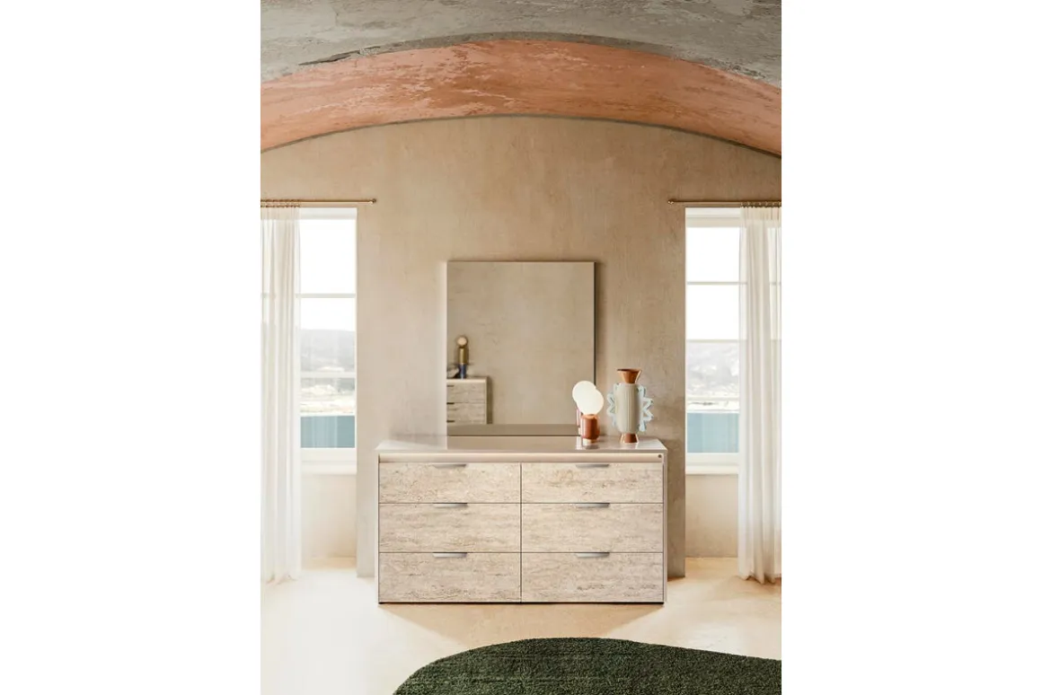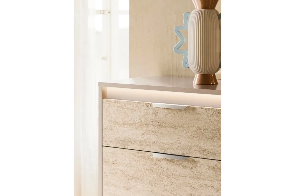 Bring modern elegance and practical nighttime convenience into your bedroom with the Tullia Dresser w/ Lights in Pearl Line/Eco Stone, a contemporary statement piece designed to elevate your daily routine. Crafted with durable melamine material for family‑friendly longevity, this dresser blends its soft Pearl Line frame with Eco Stone drawer fronts for a naturally refined look. Integrated lighting adds a gentle glow—perfect for late‑night organization or setting a calming ambiance before bedtime. Six roomy drawers provide ample space to keep clothing and essentials neatly arranged, while the clean silhouette fits seamlessly into modern and minimalist decor. Create a stylish and functional bedroom centerpiece with Tullia’s thoughtful design.