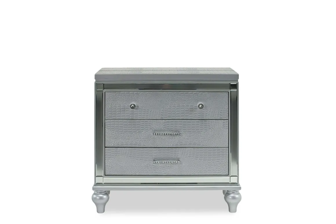 Bedside storage is a must-have in any bedroom. Whether you’re outfitting an oversized master suite or you need a little extra storage space in your guest room, you can’t go wrong with the Valentino Nightstand in Silver. Get a single for a smaller space or go for a pair to decorate both sides of the bed the same way.Product Details:• Designed to work with transitional and more modern decor styles• Multi-drawer layout lets you stay organized and keep bedside essentials handy• Pairs with Valentino beds, dressers, mirrors and moreDimensions:• 30”W x 17.375”D x 28.375”H