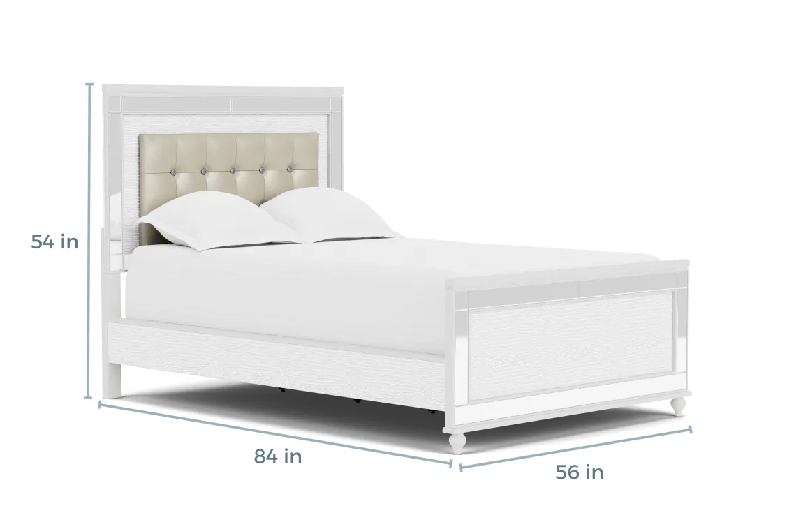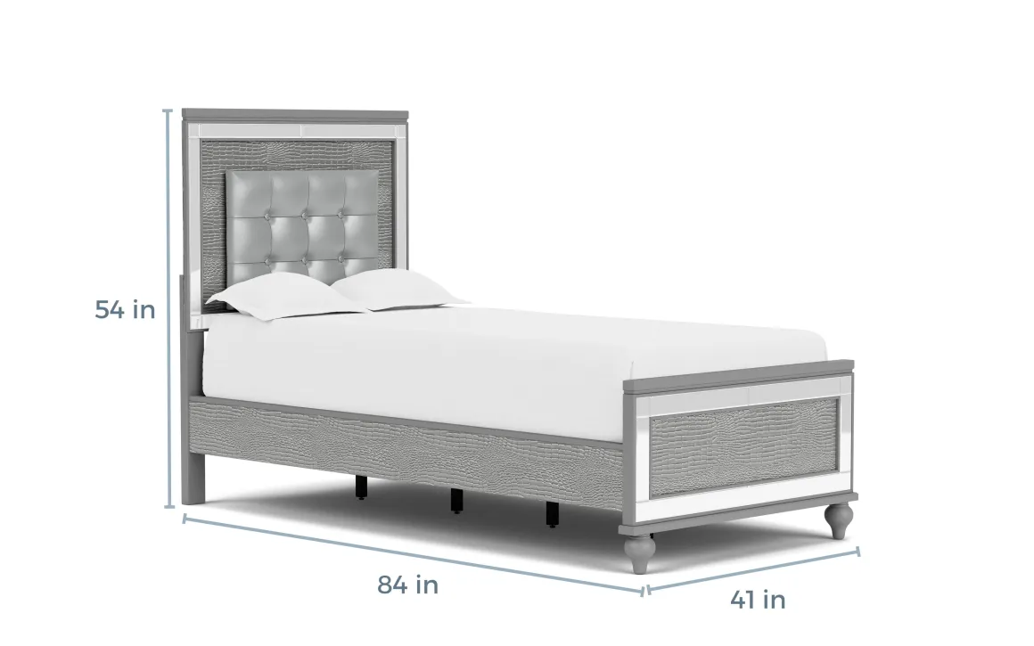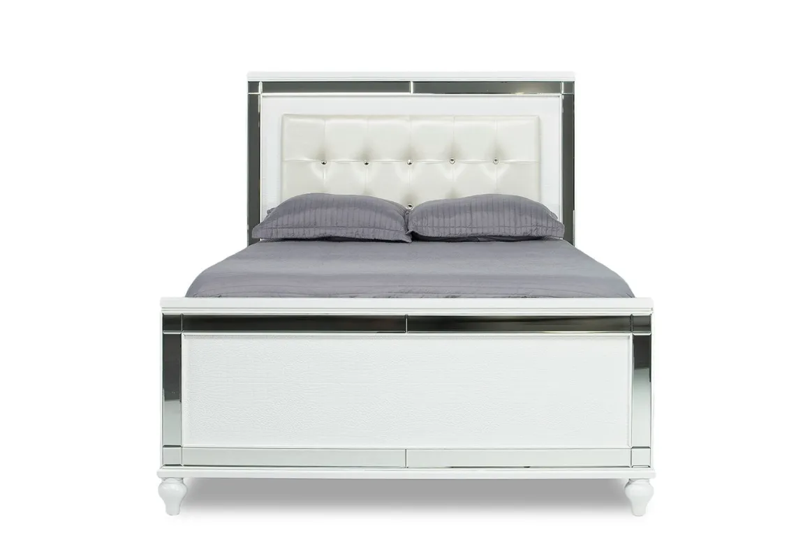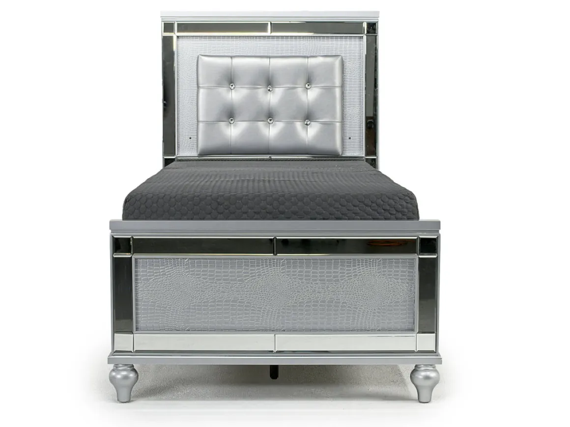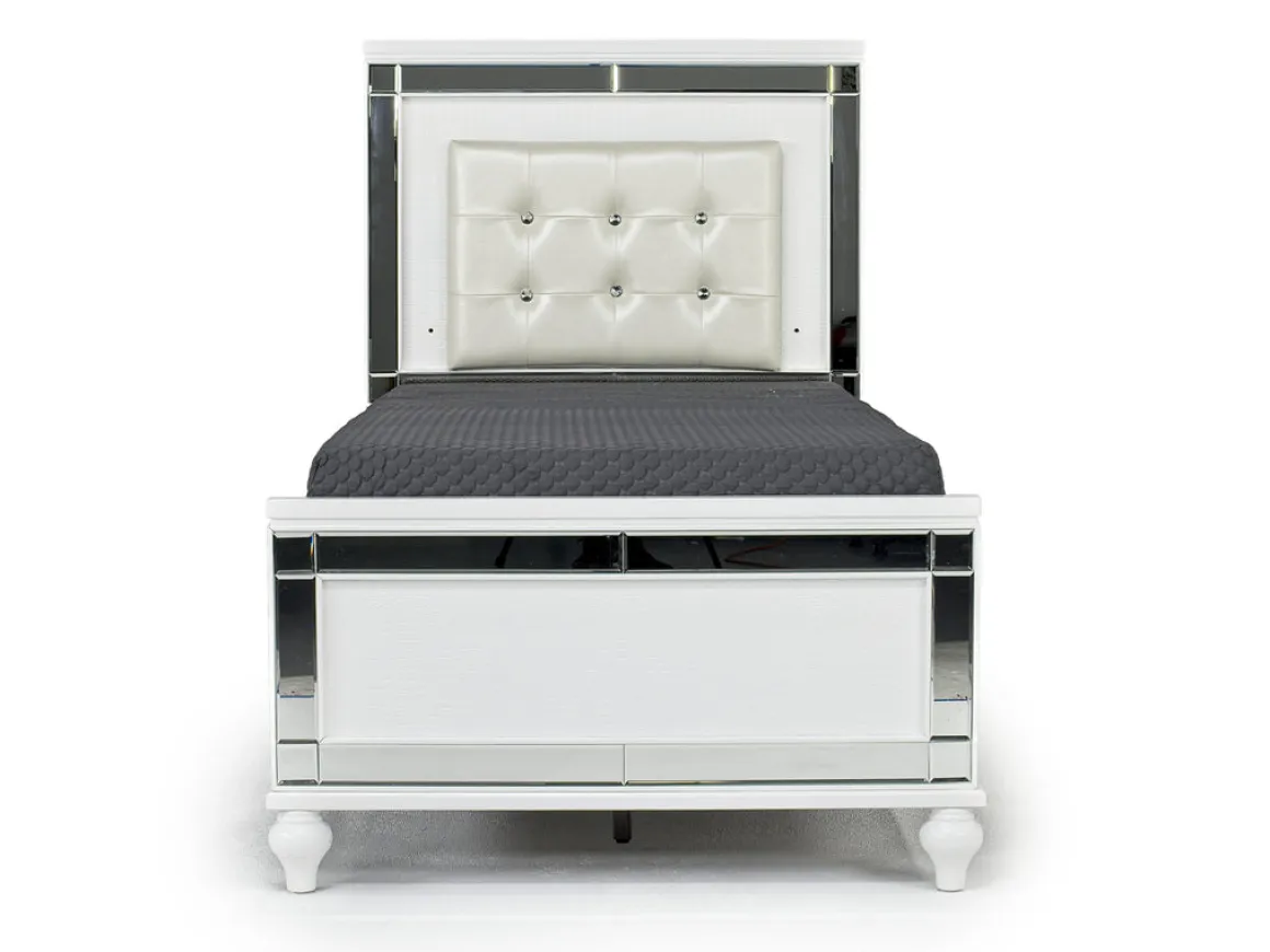 Highlighting bold chrome and bright white colors, the Valentino Panel Bed in White, Twin is the most unique bed that you’ll ever find. A luminous white paint covers the majority of the bed frame, with striking, mirror-like chrome inlays on both the headboard and the footboard. The Valentino bedroom collection is specifically for those who want to make a bold statement with their bedroom furniture, so if you’re considering purchasing this bed, then you should also purchase the Valentino Chest in White to complete the ensemble.