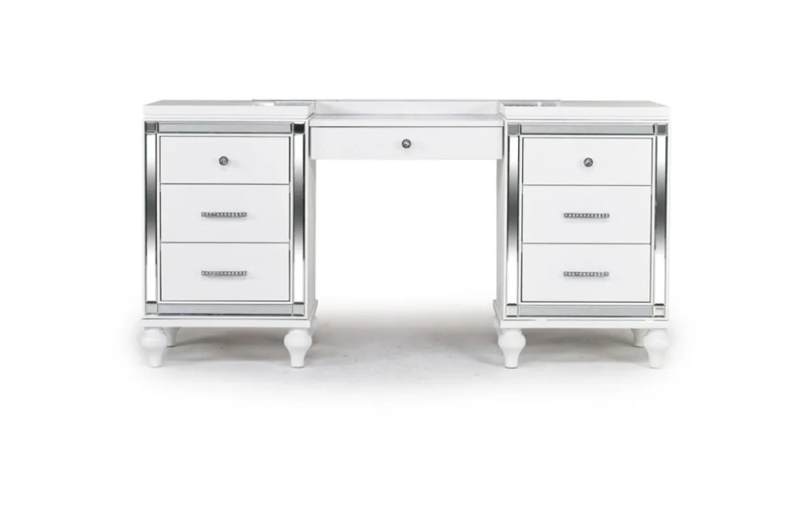 The Valentino Vanity in Silver is the perfect choice for those looking to add glamour to their beauty routine. Featuring a beautiful silver color, this vanity seamlessly blends with any existing decor, creating a cohesive and polished look. It comes with seven drawers, offering plenty of space for all your beauty essentials. Measuring 32 inches in height and 64 inches in width, this vanity provides a comfortable and spacious area for you to get ready.Product Details: • Made from high-quality hardwood solids and veneers • The English dove tail construction ensures sturdiness and strength • It showcases a sophisticated embossed inlay