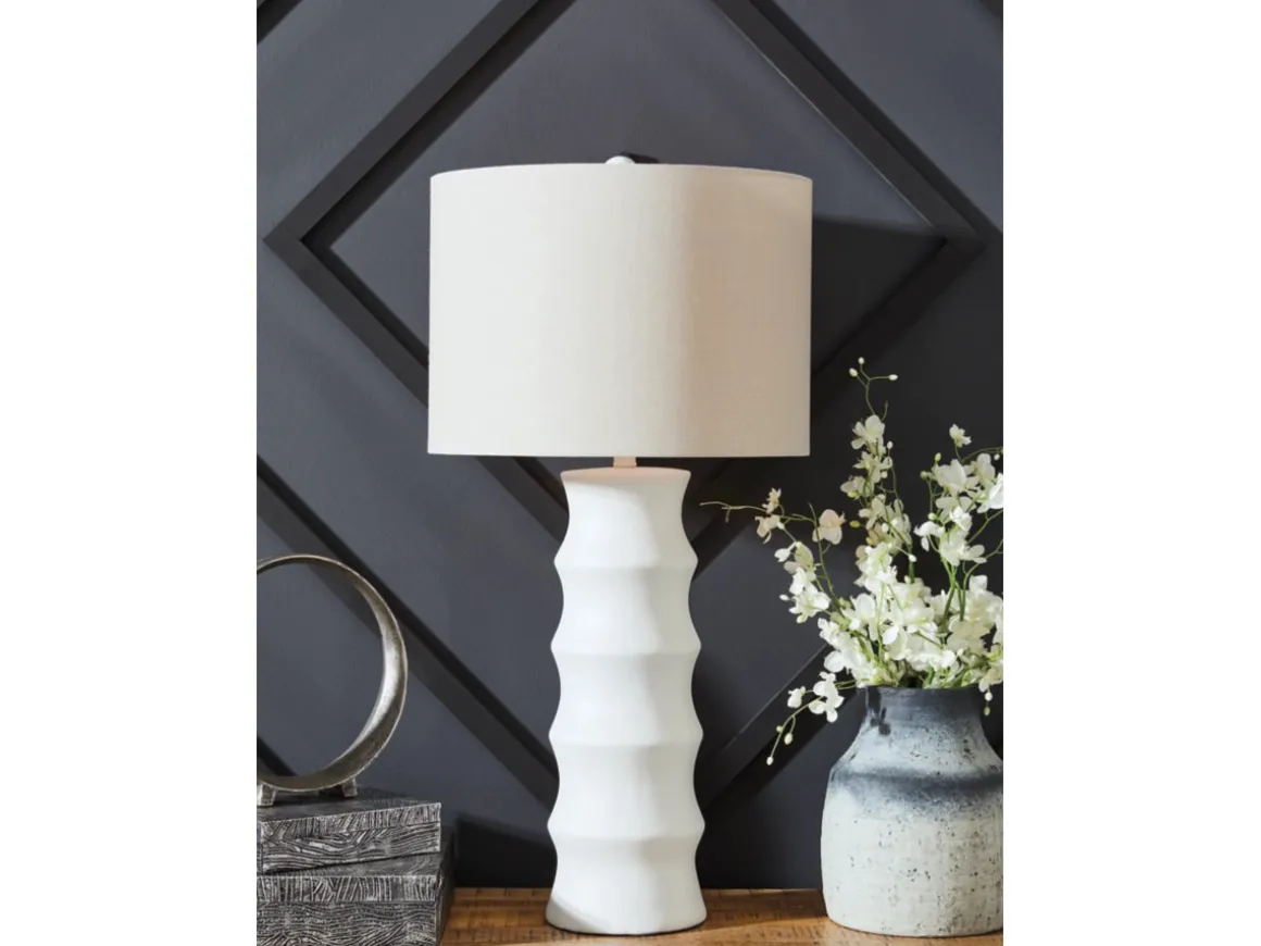 Add flair to your lair with the striking Veraleigh floor lamp. With a distinctive scalloped design and a fresh white finish, it’s cool from every angle. And its versatile style looks right at home everywhere from contemporary places to casual spaces. The matching table lamp is also a bright idea.